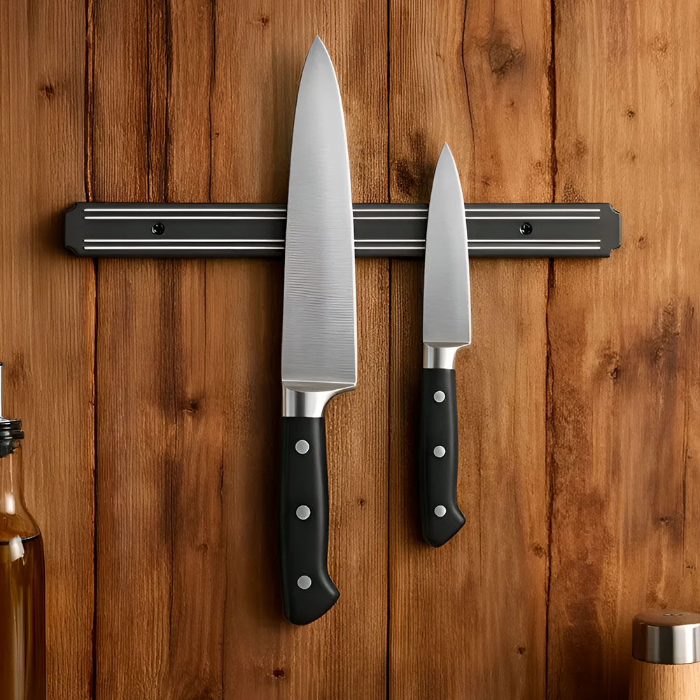Магнитный органайзер для ножей с настенным креплением — идеальное решение для экономии пространства и быстрого доступа к инструментам. Стальная конструкция с магнитными полосами надежно фиксирует лезвия, предотвращая случайные падения.