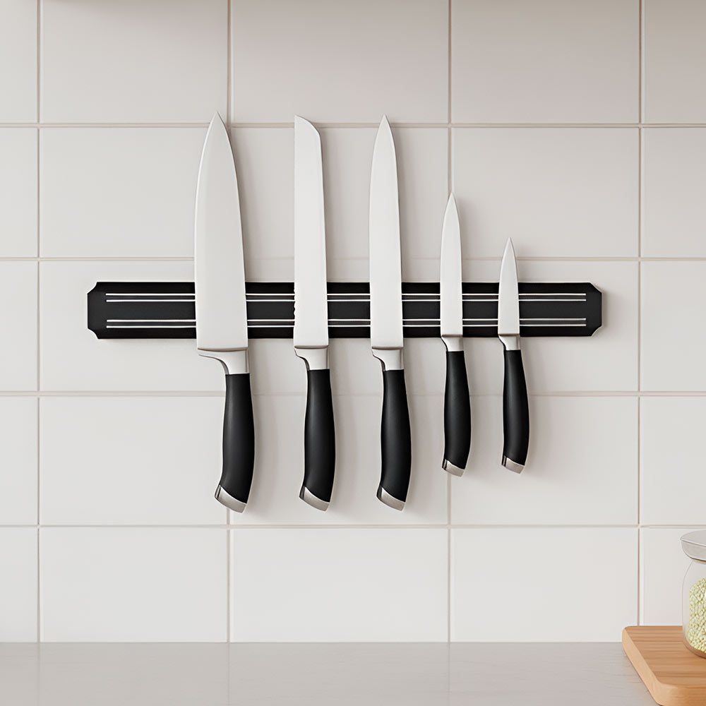 Металлический материал гарантирует прочность и долговечность, а конструкция с магнитом обеспечивает надежную фиксацию ножей без риска выпадения. Упакован в компактную картонную коробку для удобства хранения и транспортировки. Этот держатель для ножей — отличный выбор для домашнего хозяйства и профессиональных кухонь, желающих сохранить чистоту и порядок.
