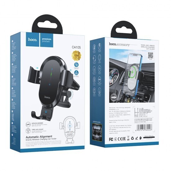 Держатель автомобильный "Hoco CA105" черный, беспроводная зарядка 15W