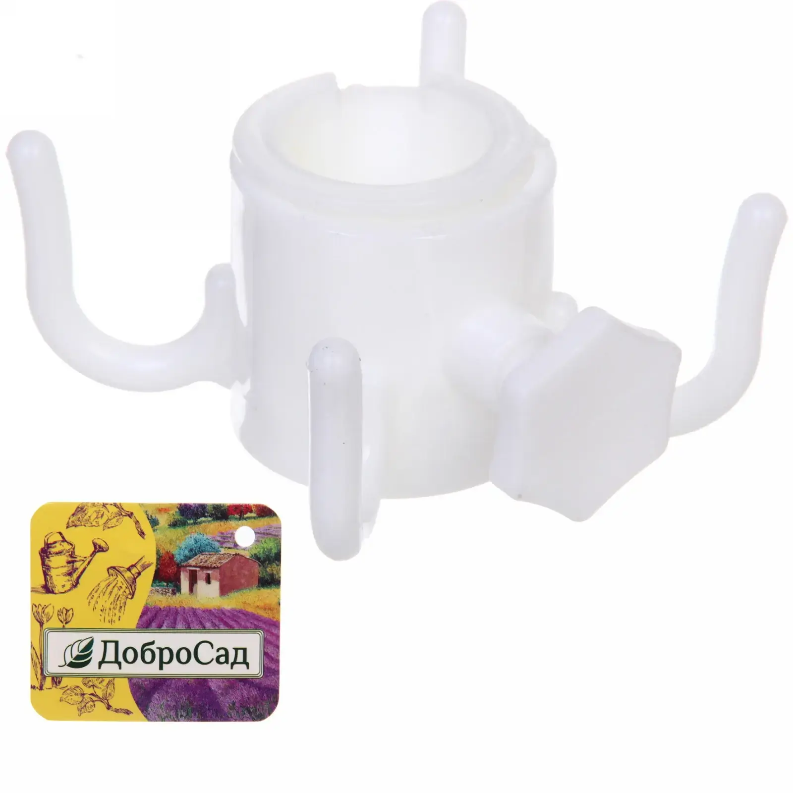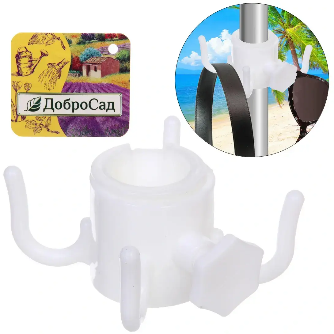 Держатель выполнен из качественного пластика, что обеспечивает его легкость и устойчивость к внешним воздействиям. Он имеет круглую центральную часть для установки и четыре выступающих крючка, что позволяет удобно фиксировать зонт. Этот аксессуар станет отличным дополнением к вашему пляжному снаряжению и сделает ваш отдых более комфортным и приятным!