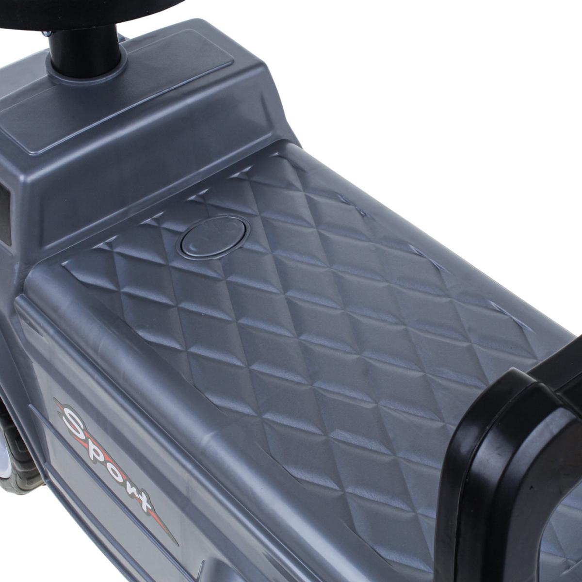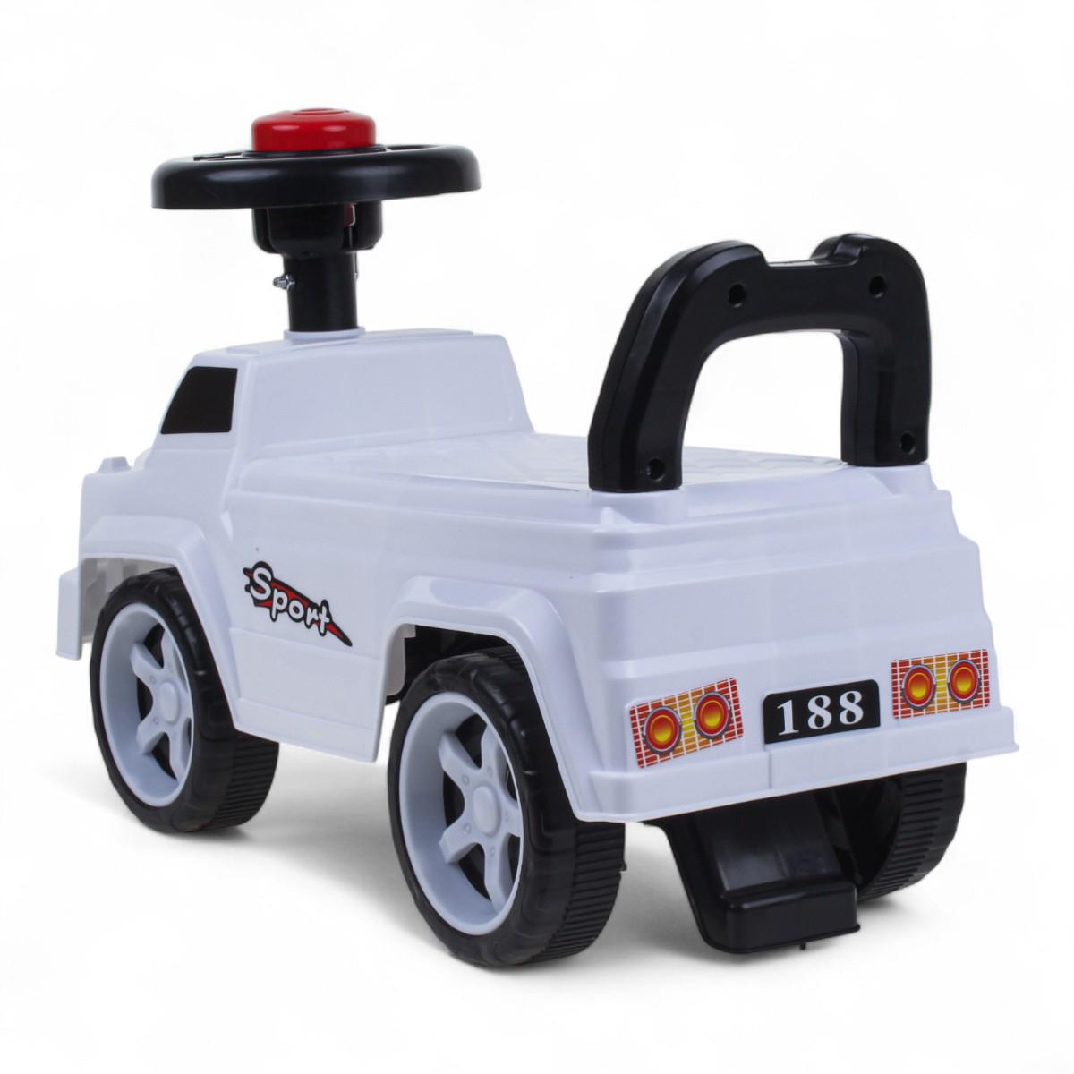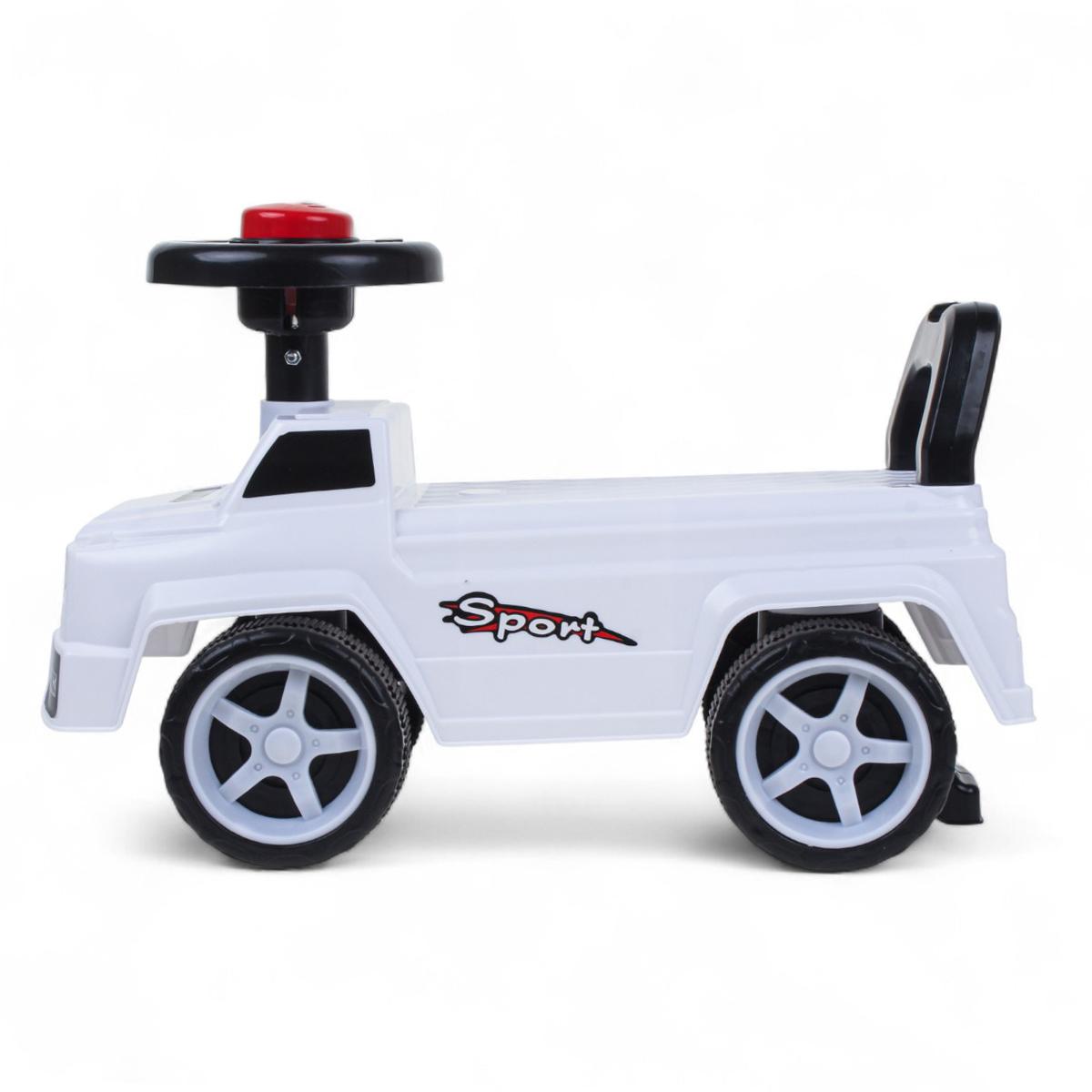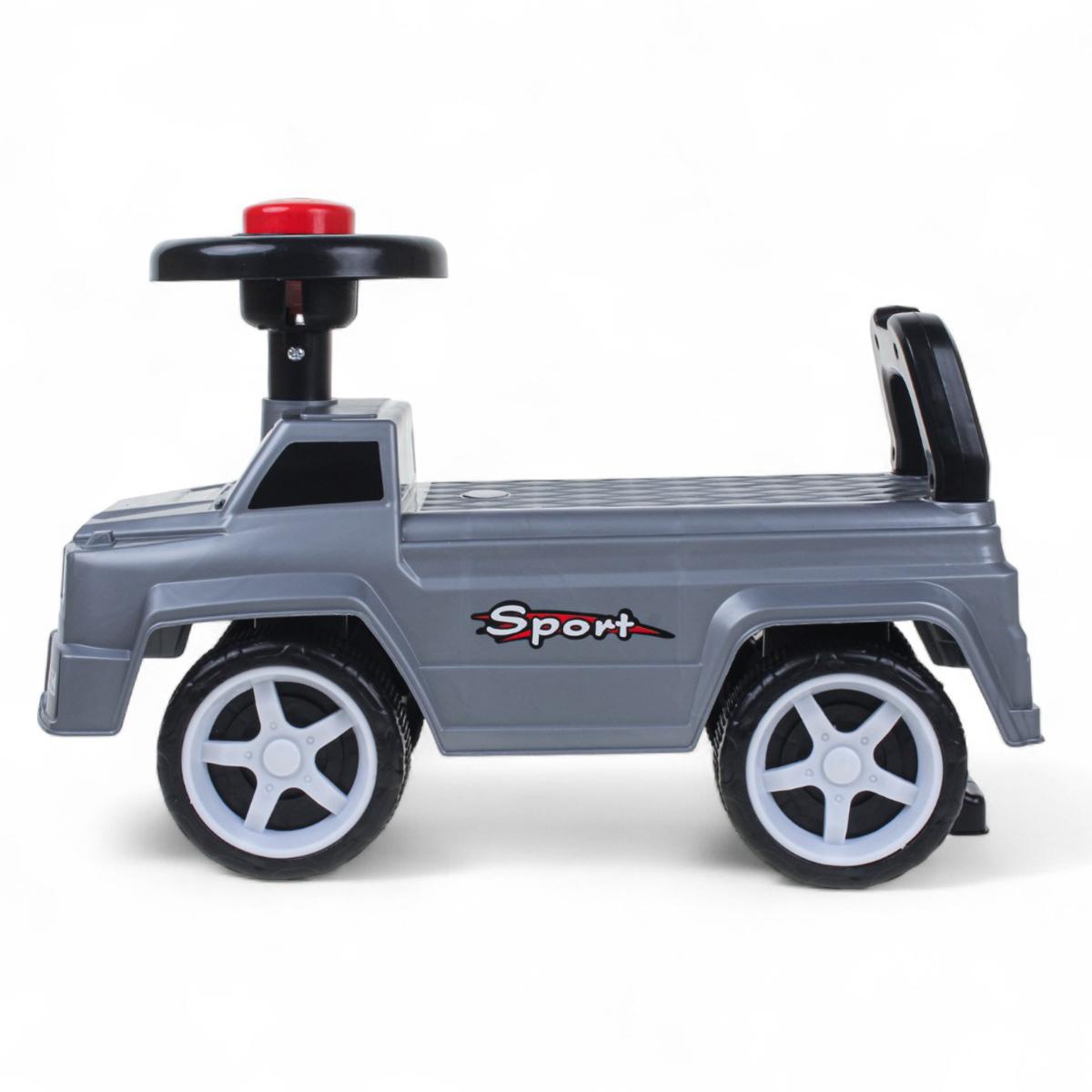 - Стильный спортивный дизайн с декоративными наклейками "Sport" и имитацией фар делает толокар похожим на настоящий внедорожник.