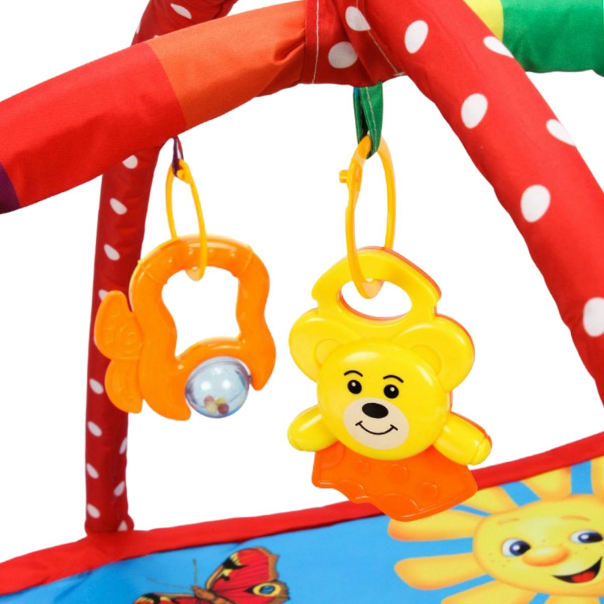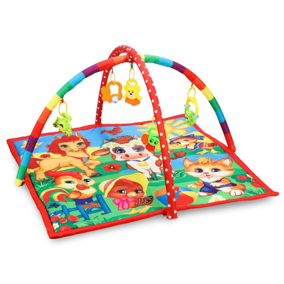 Этот яркий и эстетичный коврик станет идеальной площадкой для первых шагов и игр вашего ребенка. Оснащённым 5 съемными мягкими игрушками, 2 дугами с подвесками и тремя вариантами положения, он отлично подходит для развития мелкой моторики, зрительно-слухового восприятия и координации движений. Размер 85х85 см обеспечивает простор для активных игр, а мягкие материалы из ткани и пластмассы делают его безопасным и приятным для малыша.