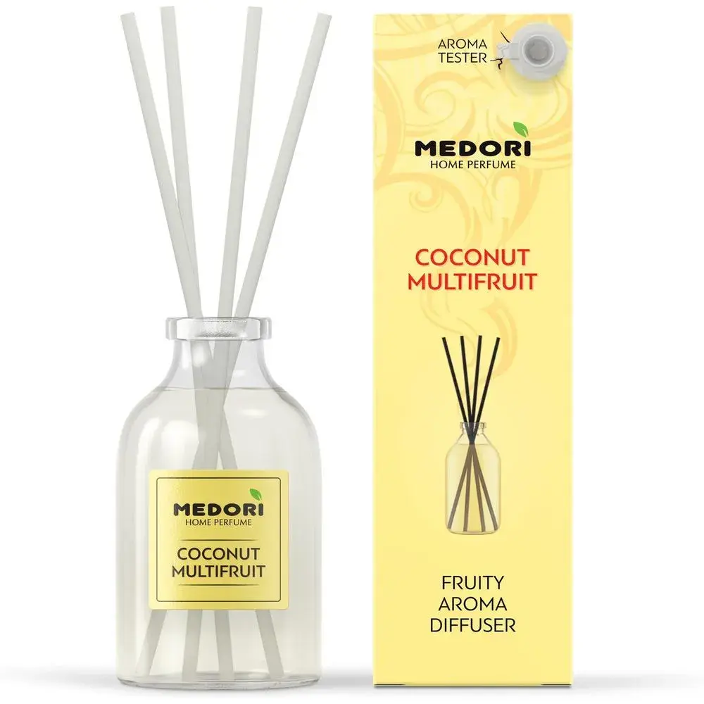 Создайте уютную атмосферу с ароматическим диффузором Medori. Наслаждайтесь гармоничным сочетанием сочного кокоса и свежих тропических нот в течение 2-3 месяцев — достаточно установить сосуд в помещении и периодически переворачивать палочки.