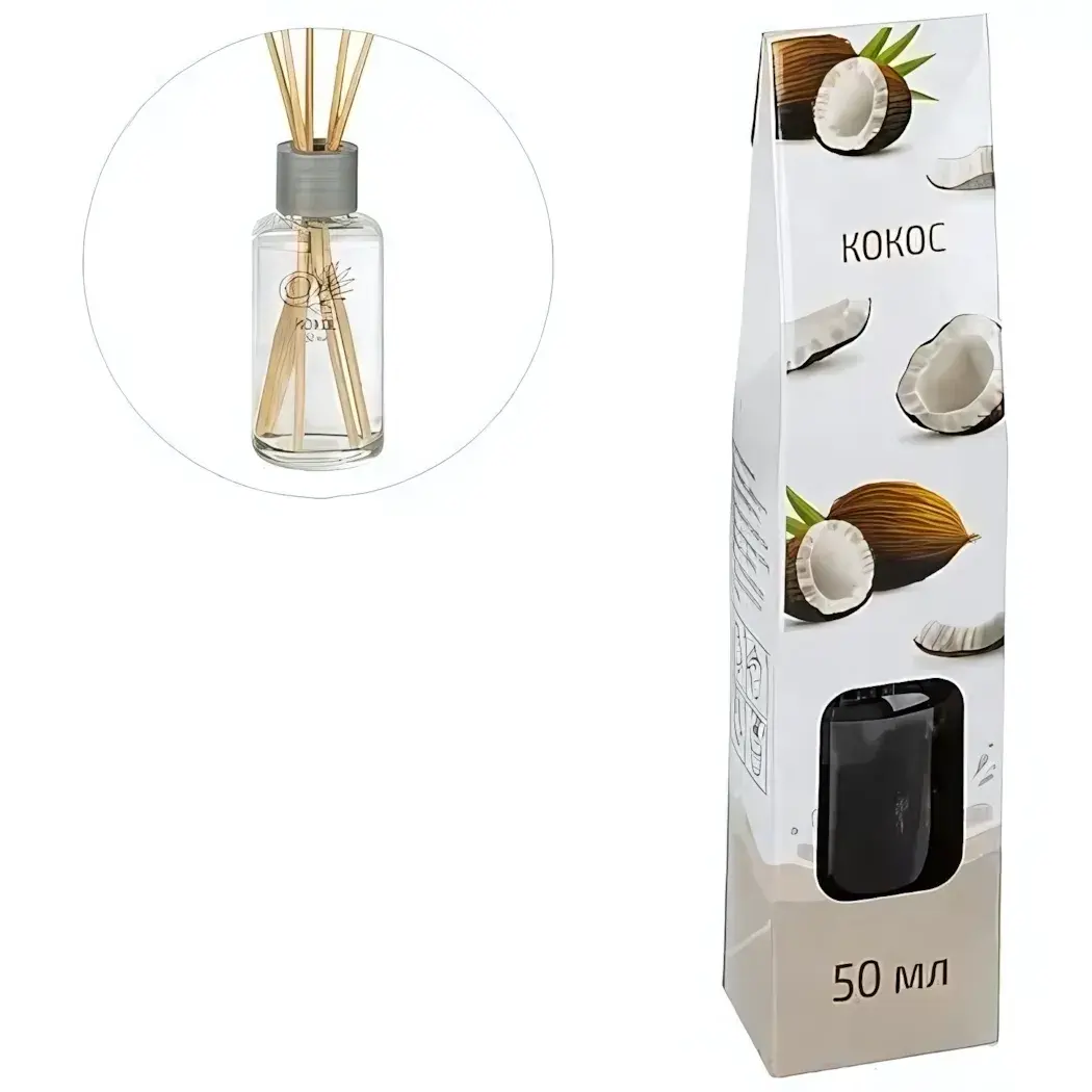 Объем флакона — 50 мл. Материал флакона — стекло, крышка пластиковая. Аромат — кокос. Состав включает натуральную отдушку и безопасные компоненты для равномерного распространения запаха. Идеален для гостиной, спальни, офиса и других помещений, где ценится спокойная и уютная атмосфера.