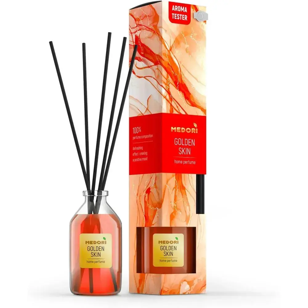 Аромадиффузор Golden Skin — ваш персональный источник комфорта и гармонии в доме. Стеклянный флакон с элегантными ароматическими палочками наполнит комнату стойким благородным запахом, который сохраняется до 8 недель.