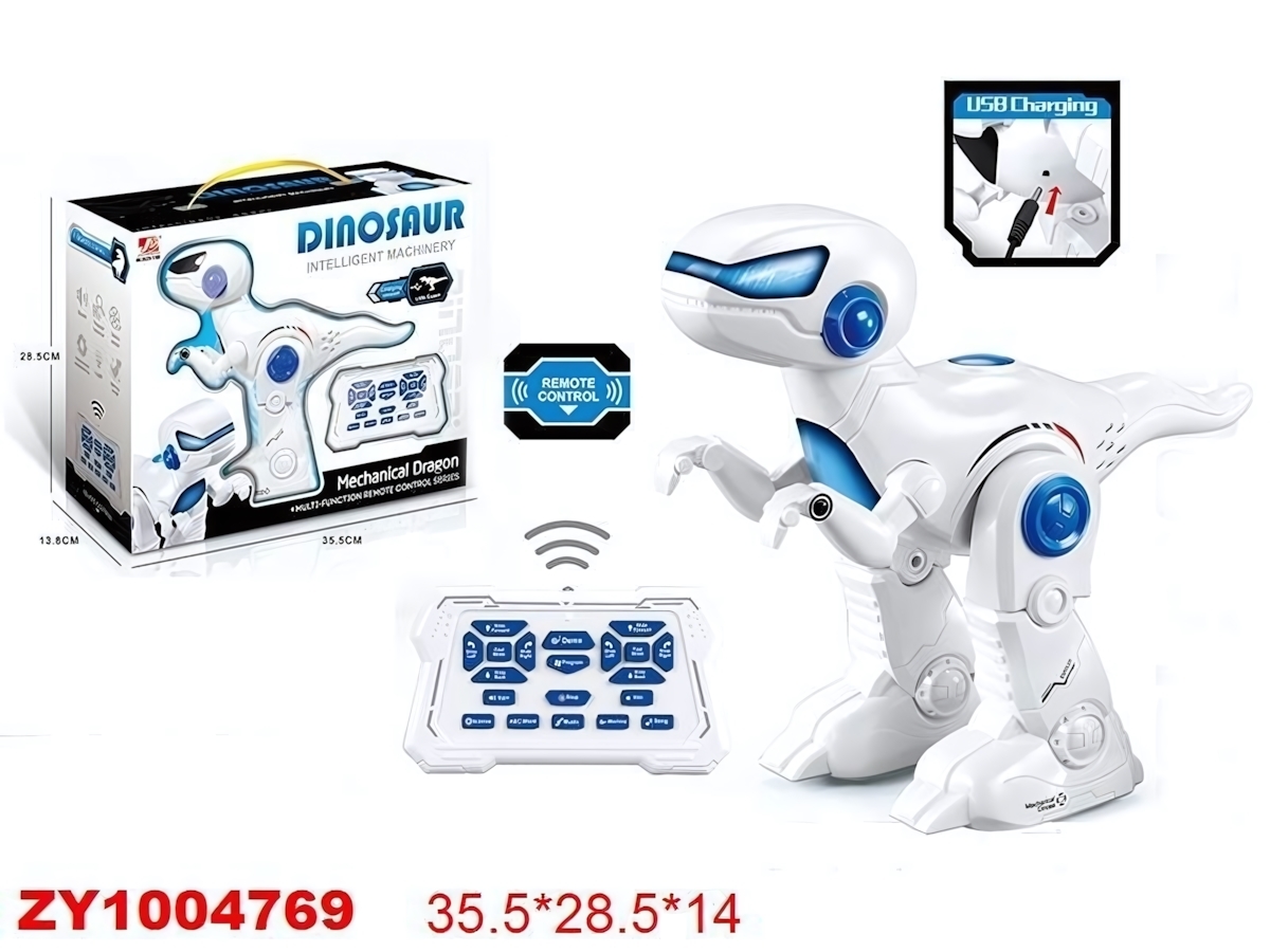 Игрушка выполнена в бело-синей цветовой гамме с детализированными механическими элементами. В комплект входит пульт управления, а для начала игры достаточно подключить устройство к любому USB-порту. Размеры упаковки позволяют легко разместить динозавра на полке или транспортировать.