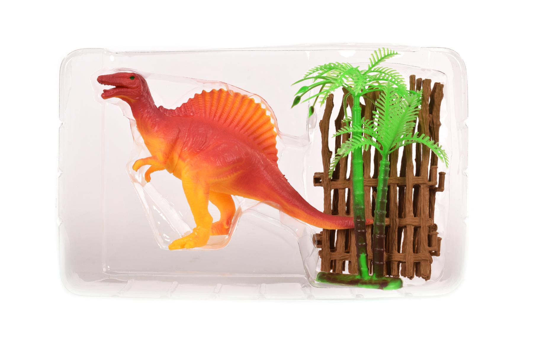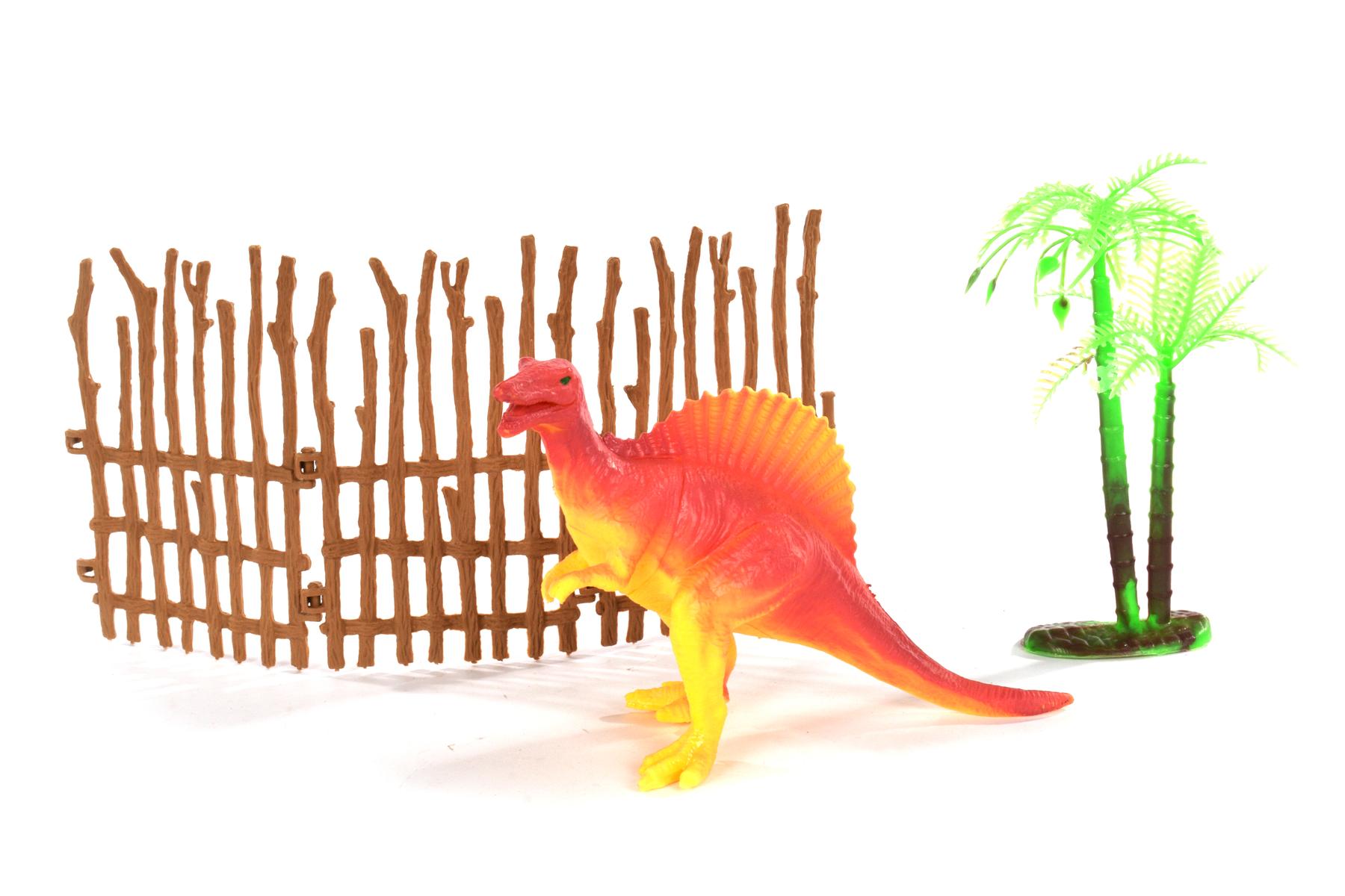 Набор включает в себя фигурку динозавра спинозавра, две пластиковые пальмы и имитацию забора. Упаковка – пакет с хедером, размер упаковки: 26*21,5*5 см. Материал – ПВХ.
