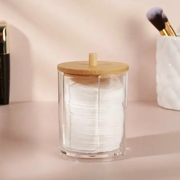 Диспенсер выполнен из качественного пластика и бамбука, что обеспечивает его долговечность и надежность. Прозрачный корпус позволяет видеть содержимое, а натуральные материалы делают его безопасным для использования. Размеры 11х7 см идеально подходят для хранения стандартных ватных дисков, что делает его универсальным решением для любого дома.