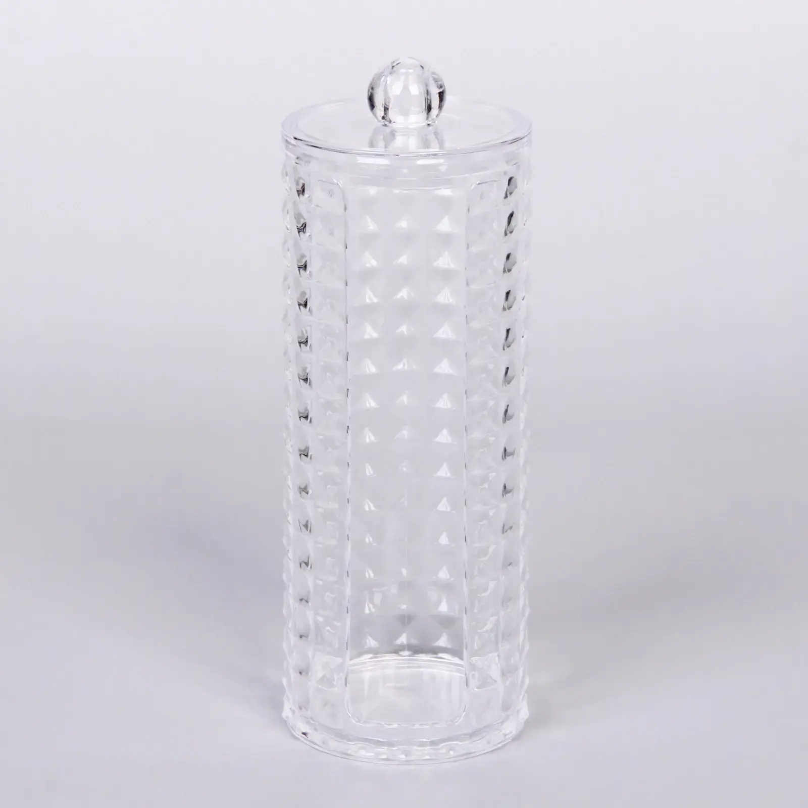 Прозрачный диспенсер для ватных дисков с рельефным узором сочетает практичность и эстетику. Цилиндрическая форма с герметичной крышкой защищает содержимое от влаги и пыли, сохраняя гигиеничность каждого диска.