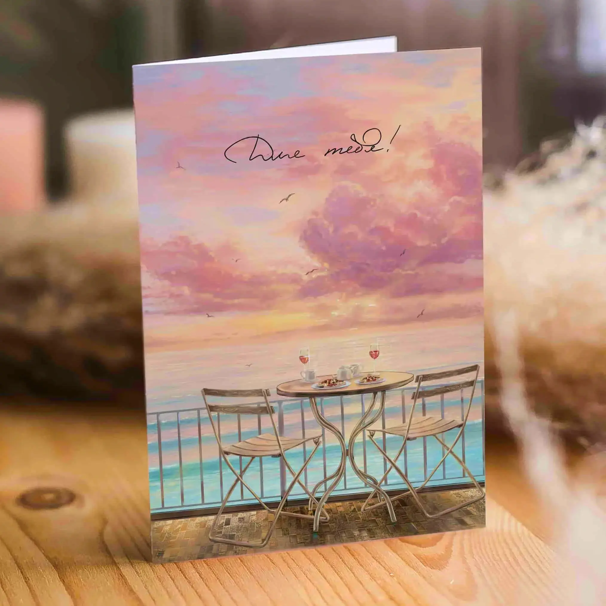 Эта уникальная дизайнерская открытка станет идеальным способом выразить свои чувства и поздравить близкого человека. С её помощью вы сможете создать атмосферу тепла и уюта, которая запомнится надолго. Открытка выполнена в горизонтальном формате и украшена красивой иллюстрацией, изображающей романтический закат над морем, что добавляет ей особую изюминку.