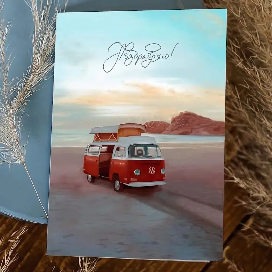 Эта уникальная открытка станет идеальным способом поздравить близких и друзей с важными событиями. Яркий дизайн с изображением красного фургона Volkswagen на фоне пляжа создает атмосферу радости и праздника. Пастельные тона и элегантный шрифт надписи «Поздравляю!» добавляют открытке особый шарм и делают её подходящей для любого случая.