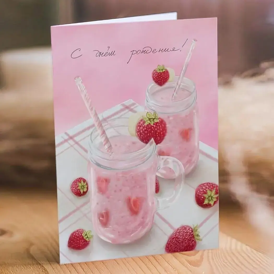 Размер открытки составляет 15х10 см, что делает её удобной для хранения и отправки. Она легко помещается в конверт стандартного размера. Открытка выполнена из плотного картона, что обеспечивает её долговечность и устойчивость к повреждениям. Праздничный дизайн с изображением клубники и смузи создаёт атмосферу праздника и радости, что делает её идеальным выбором для любого дня рождения.