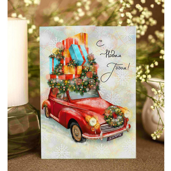 Открытка выполнена в ярких цветах, с изображением красного автомобиля, украшенного подарками и элементами декора. Размер открытки стандартный, что позволяет легко её хранить и отправлять. Праздничный текст «С Новым Годом!» добавляет особую атмосферу, делая каждое поздравление уникальным.