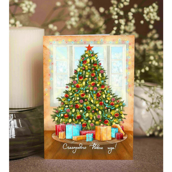 Открытка выполнена из мягкой бумаги, что придаёт ей особую текстуру и ощущение. Она оформлена в теплых тонах с рождественским фоном и мягким светом, что делает её идеальным дополнением к любому подарку. Не упустите возможность порадовать своих близких и друзей этой замечательной открыткой, которая станет частью их новогодних воспоминаний!