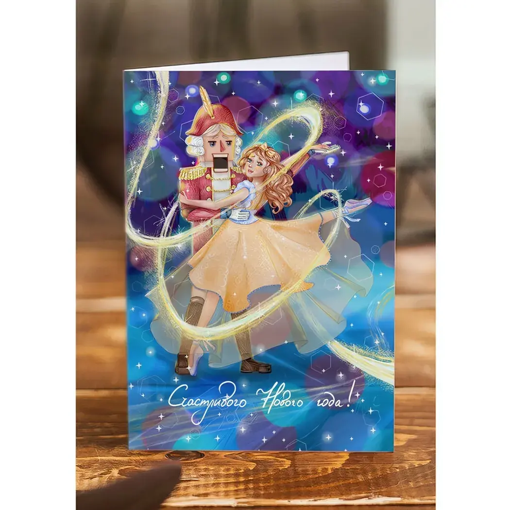 Создайте атмосферу праздника с дизайнерской открыткой «Щелкунчик», которая станет идеальным дополнением к вашим новогодним поздравлениям. Яркие сине-фиолетовые тона, блестки и световые эффекты делают эту открытку настоящим произведением искусства, способным передать все волшебство новогодних праздников.