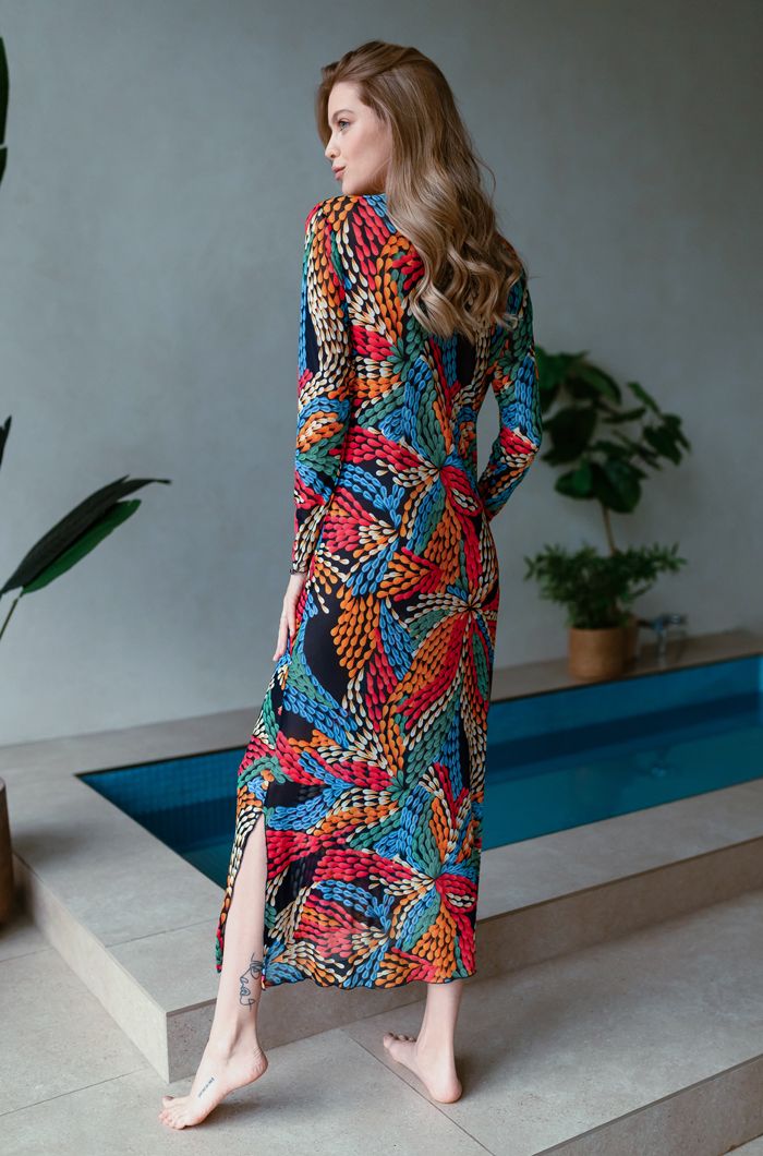 Эта элегантная туника миди-длины станет идеальным спутником для отдыха у воды, прогулок по городу или романтического вечера. Её свободный крой и лёгкая драпирующаяся ткань дарят невероятный комфорт, позволяя коже дышать даже в самый жаркий день. Яркий разноцветный принт, напоминающий тропические цветы или морские волны, привлекает внимание и поднимает настроение, делая вас центром всеобщего восхищения.