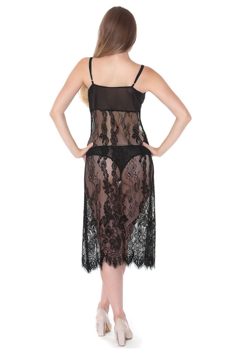 Длинная полупрозрачная сорочка из черного кружева создана для особенных моментов. Ее изысканный дизайн подчеркивает женственность и создает ощущение нежности и загадочности. Модель идеально подойдет для создания романтического образа, который запомнится надолго.