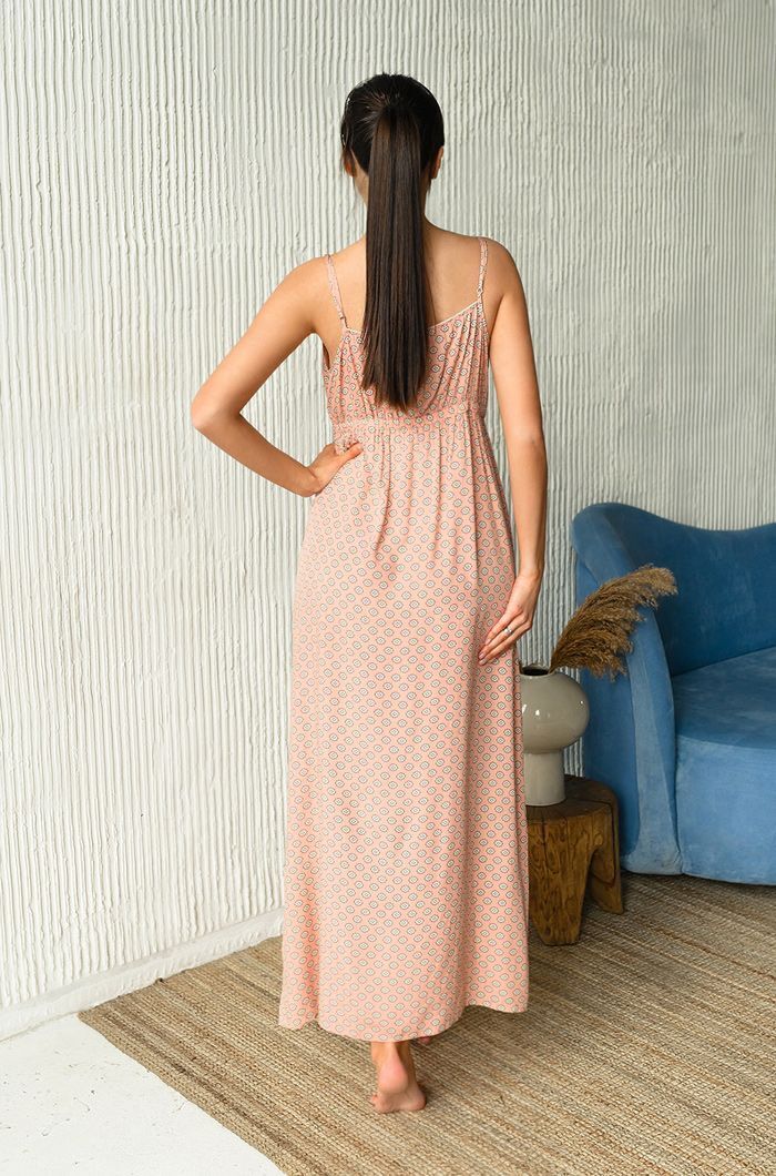 Платье с отрезной линией под грудью на эластичной тесьме-резинке позволяет легко регулировать посадку, а тонкие бретели дают возможность настроить высоту лифа под ваши предпочтения. Это делает платье универсальным вариантом для различных типов фигур и стилей.