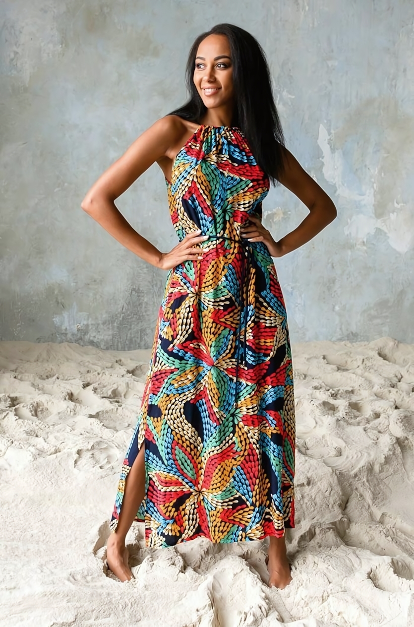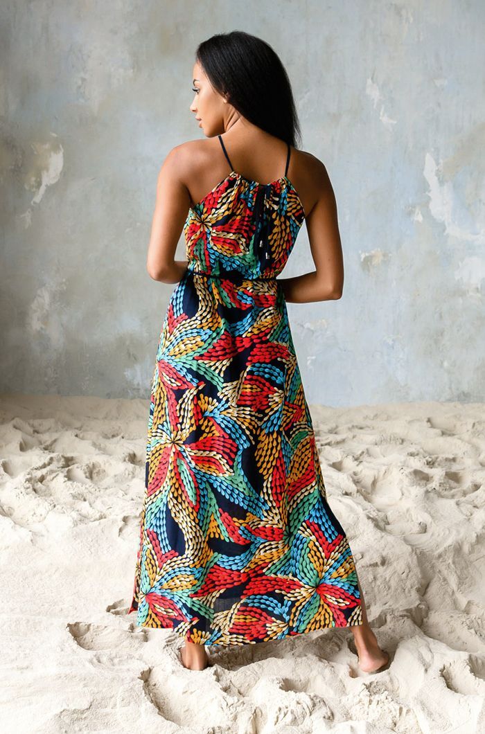 Платье подходит для прогулок, отдыха или специальных мероприятий, особенно в теплую погоду. Яркий принт и насыщенные цвета делают его универсальным для сочетания с различными аксессуарами и обувью. Выполненное по европейским стандартам, оно гарантирует долговечность и насыщенность цветовых оттенков даже при частых стирках.