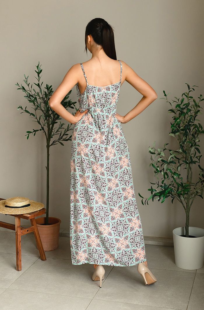 Это длинное платье прямого силуэта станет идеальным выбором для тех, кто ценит комфорт и элегантность. Выполненное из 100% вискозы, оно обеспечивает легкость и воздухопроницаемость, что делает его идеальным для теплых дней. Яркий принт с геометрическими и цветочными элементами добавляет изюминку, а тонкие бретели позволяют регулировать высоту лифа, что обеспечивает идеальную посадку.