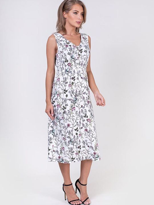 Платье выполнено из приятной на ощупь трикотажной ткани на основе вискозы с добавлением эластана. Такой состав обеспечивает мягкость, хорошую воздухопроницаемость и лёгкую тягучесть, которая адаптируется к контурам тела. Мелкий цветочный принт, равномерно распределённый по всей поверхности, состоит из изящных соцветий и веточек в пастельных тонах. Модель без рукавов с V-образным вырезом горловины визуально вытягивает силуэт.