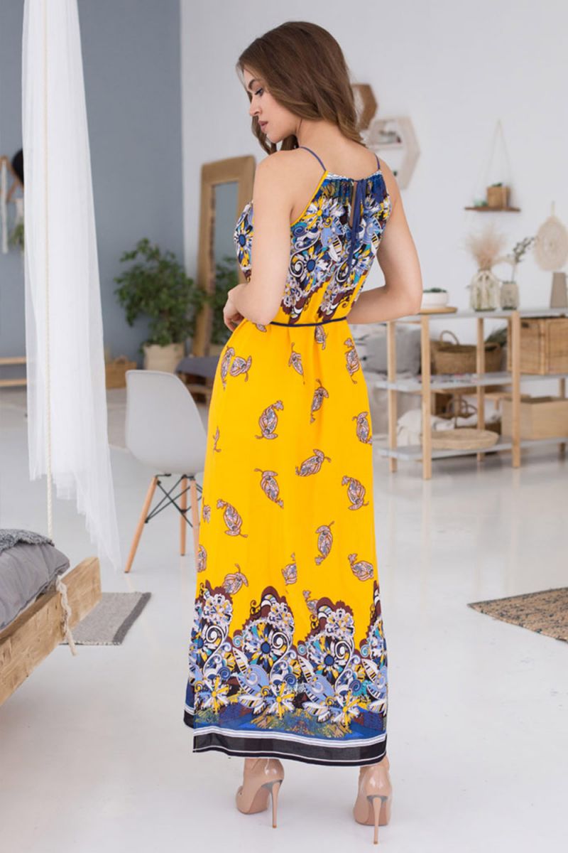 - Особенности модели: Приталенный силуэт, тонкие бретели, округлая горловина, регулируемая шнуровкой, разрезы по бокам, длинная юбка до щиколоток, декоративный пояс.
