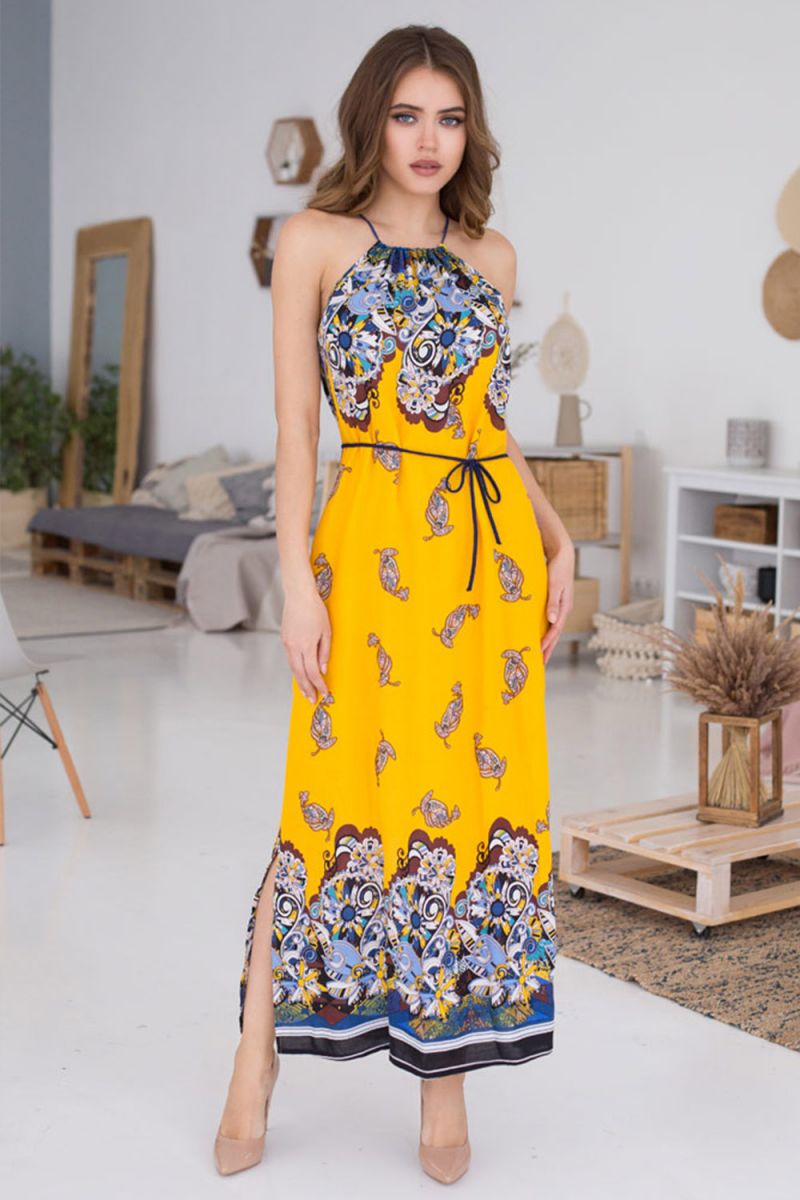 Это платье создано для тех, кто ценит женственность, элегантность и внимание к деталям. Приталенный силуэт подчеркивает фигуру, а легкая вискозная ткань струится по телу, создавая ощущение невероятного комфорта и свободы движений. Яркий желтый цвет с замысловатым многоцветным орнаментом делает образ по-настоящему запоминающимся и солнечным.