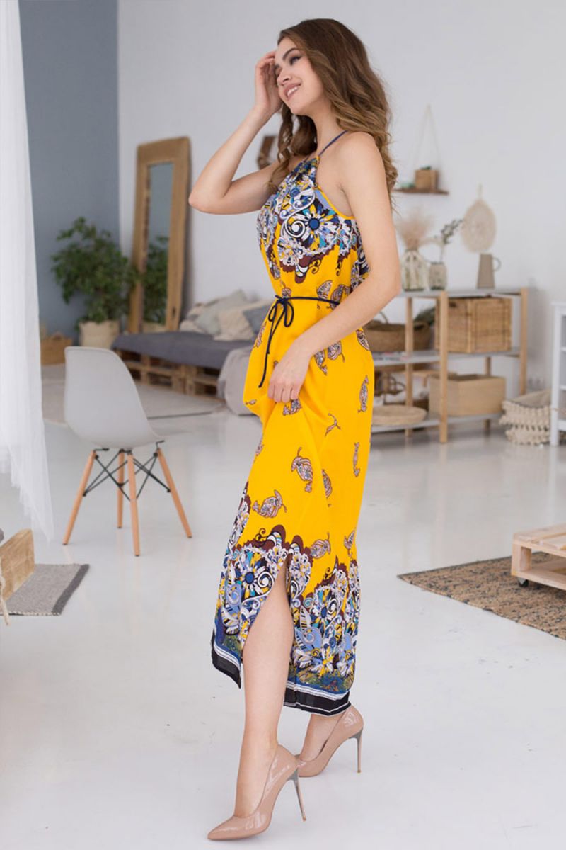 Длинное приталенное платье из мягкой вискозы станет идеальным выбором для торжественных мероприятий, романтических свиданий или создания стильного повседневного образа. Желтый цвет в сочетании с многоцветным орнаментальным принтом создает солнечное, жизнерадостное настроение, а продуманный крой подчеркивает достоинства фигуры.