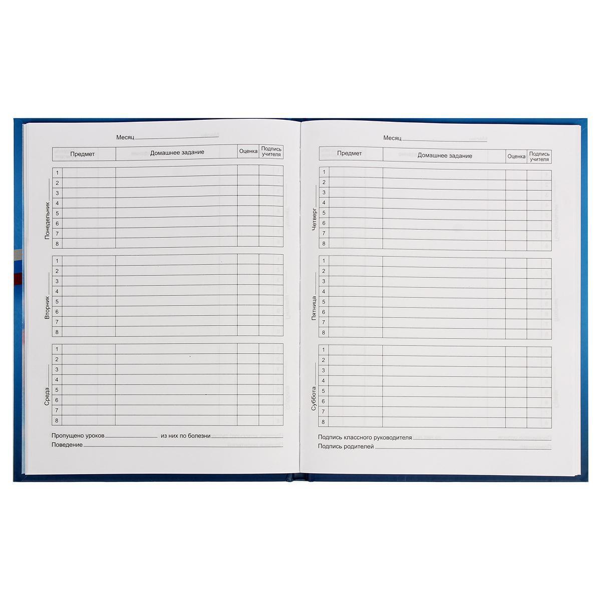 Твёрдый дневник с государственной символикой создан для систематизации расписания и контроля успеваемости. Прочная глянцевая обложка сохранит презентабельный вид в течение всего учебного года.