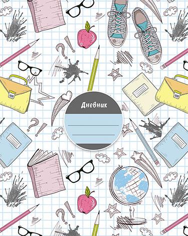 Дневник выполнен в удобном формате 165х210 мм, содержит 40 листов из белой бумаги с аккуратной синей печатью. Переплет прошит нитками, что обеспечивает долговечность и препятствует выпадению страниц. Дизайн сочетает элементы школьного скетча: глобусы, книги, кеды, тетради, канцелярские предметы и графические акценты, что делает дневник современным и привлекательным для школьников разного возраста.