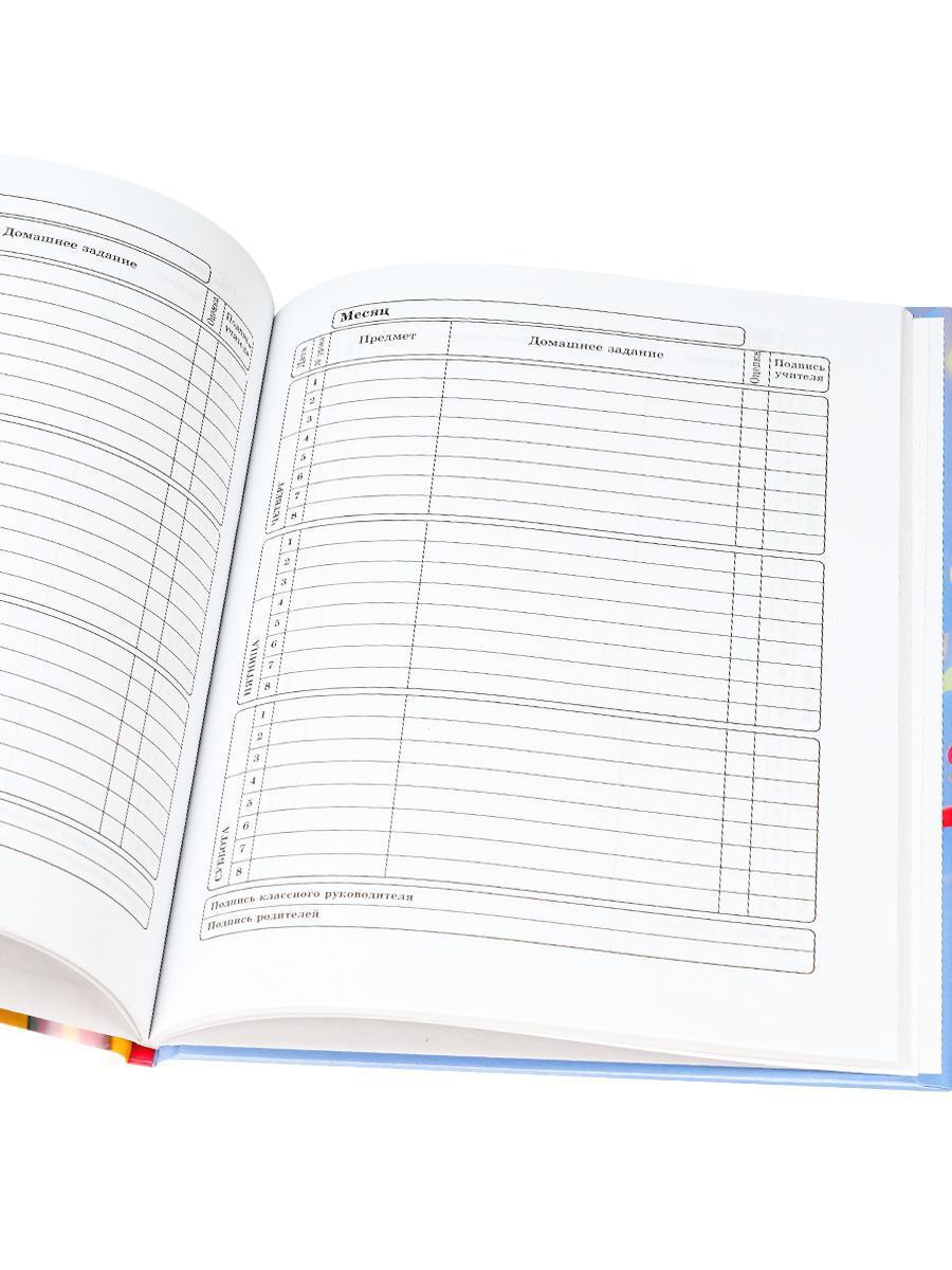 Этот дневник станет незаменимым помощником в организации учебного процесса. В нем удобно записывать расписание уроков, домашние задания и оценки. Разделы для личных данных, сведений об успеваемости и контактов учителей помогут всегда держать важную информацию под рукой.