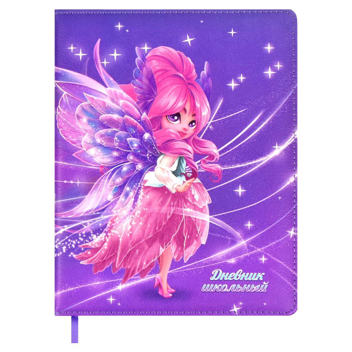 Изделие украшено яркой иллюстрацией феи с прозрачными крыльями и цветным декором, создающим праздничное настроение. Дополнительные элементы включают закладку из ляссе, индивидуальную упаковку из ПЭТ-пакета и полезные справочные материалы внутри, что делает дневник максимально практичным и стильным.