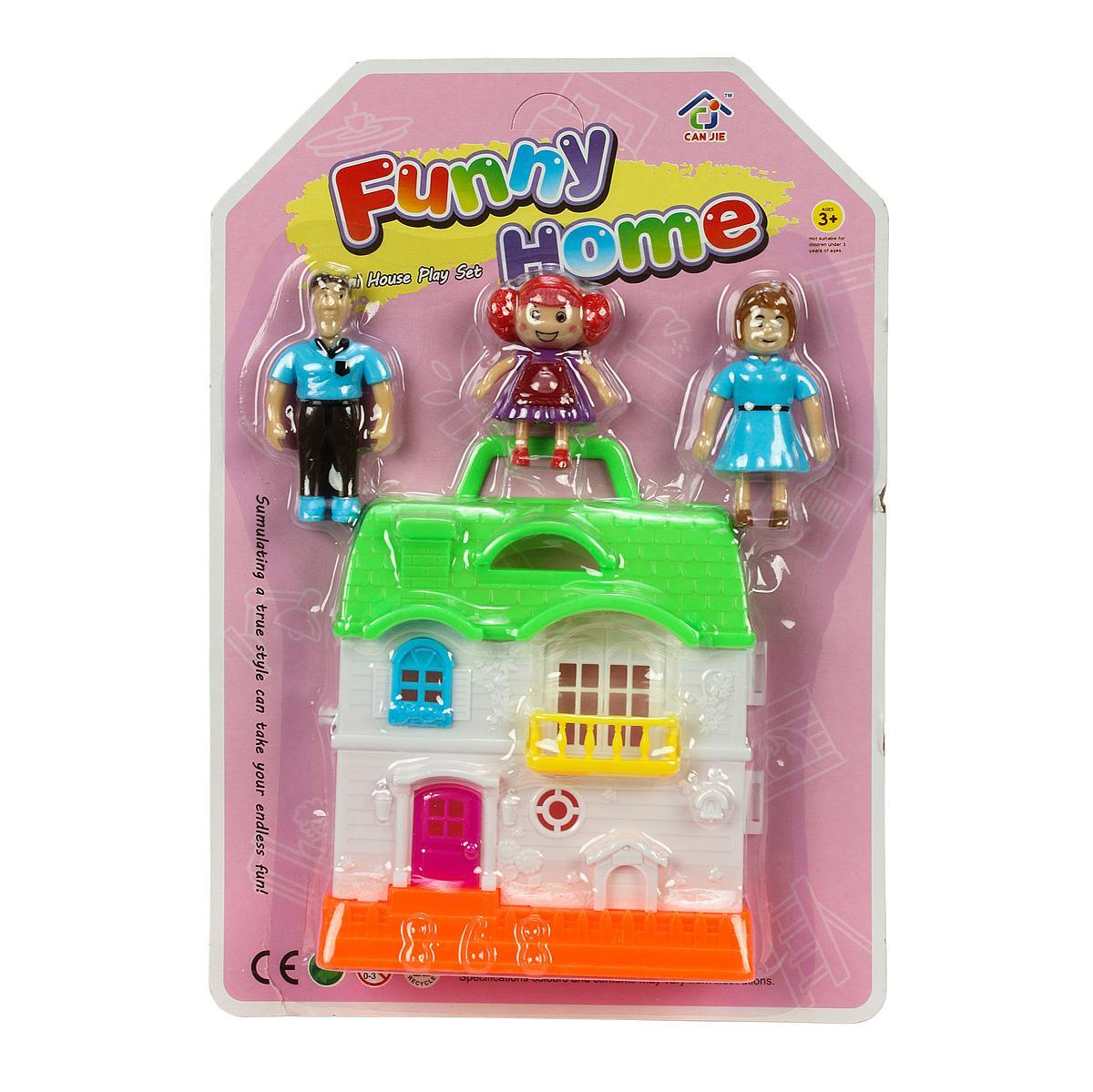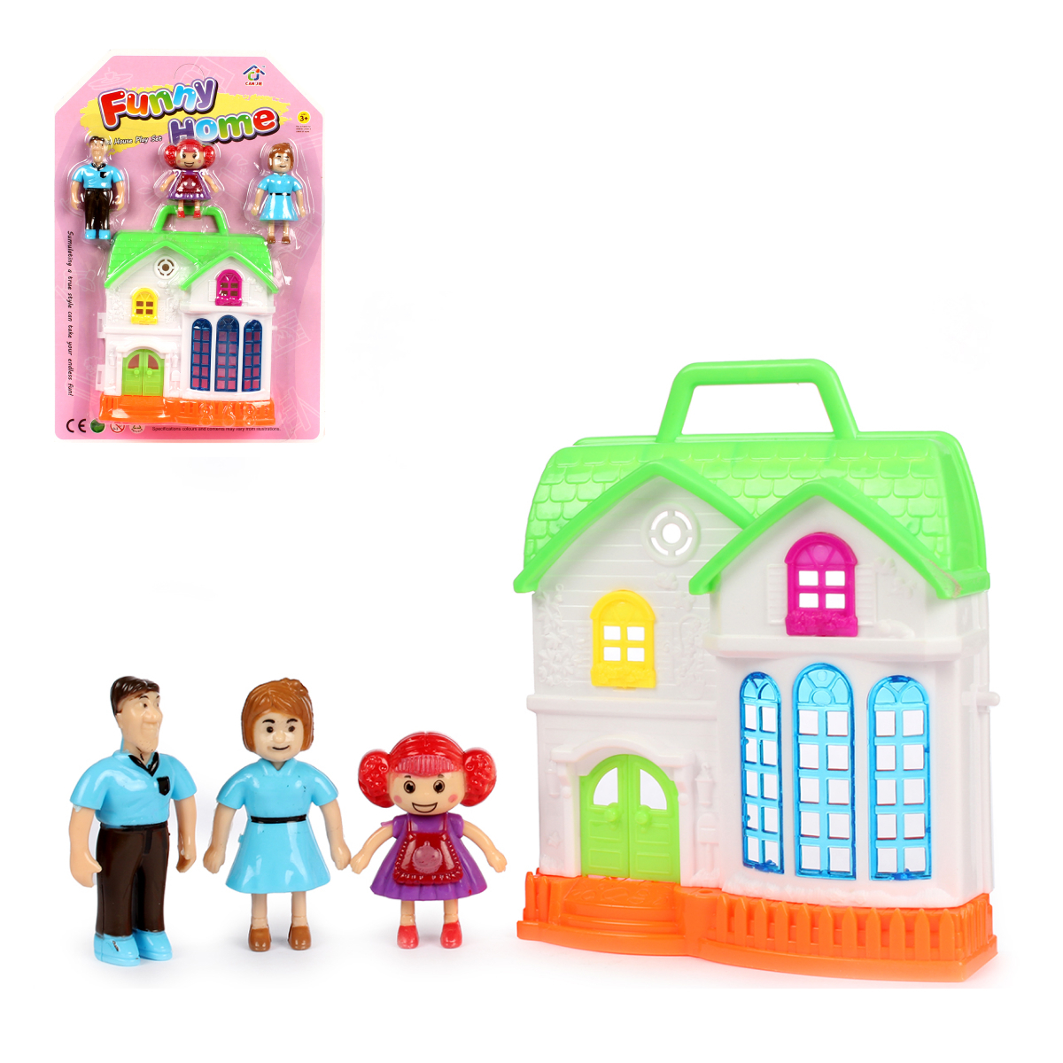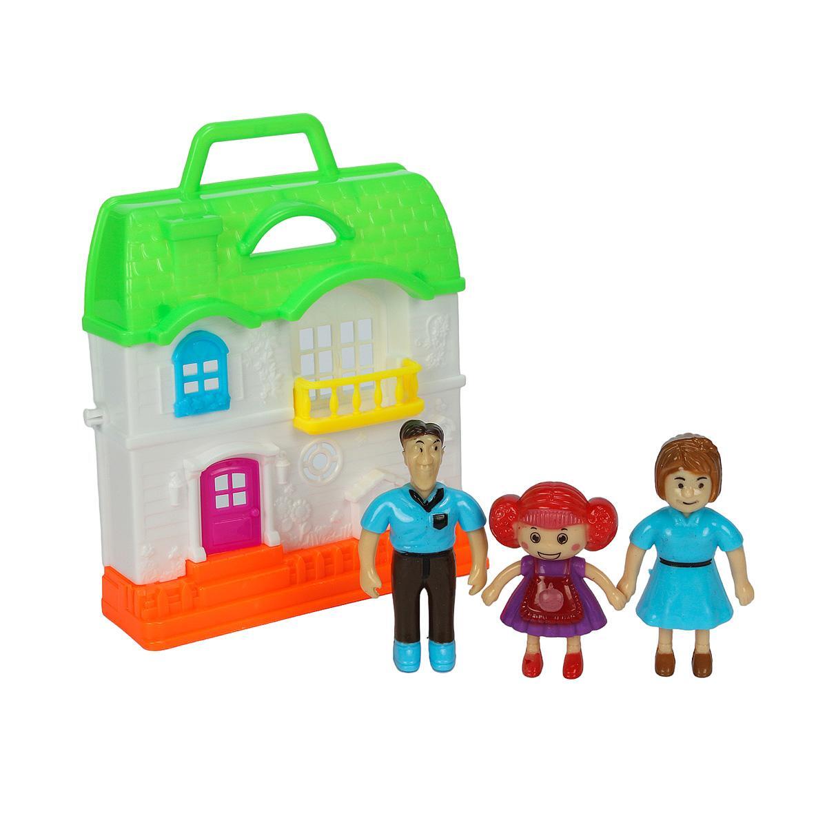 Домик выполнен в белом цвете с зеленой крышей и яркими элементами, что делает его привлекательным для детей. Фигурки людей также выполнены в ярких цветах, что добавляет веселья в игру. Размеры домика не указаны, но он подходит для детских рук и легко переносится благодаря ручке.