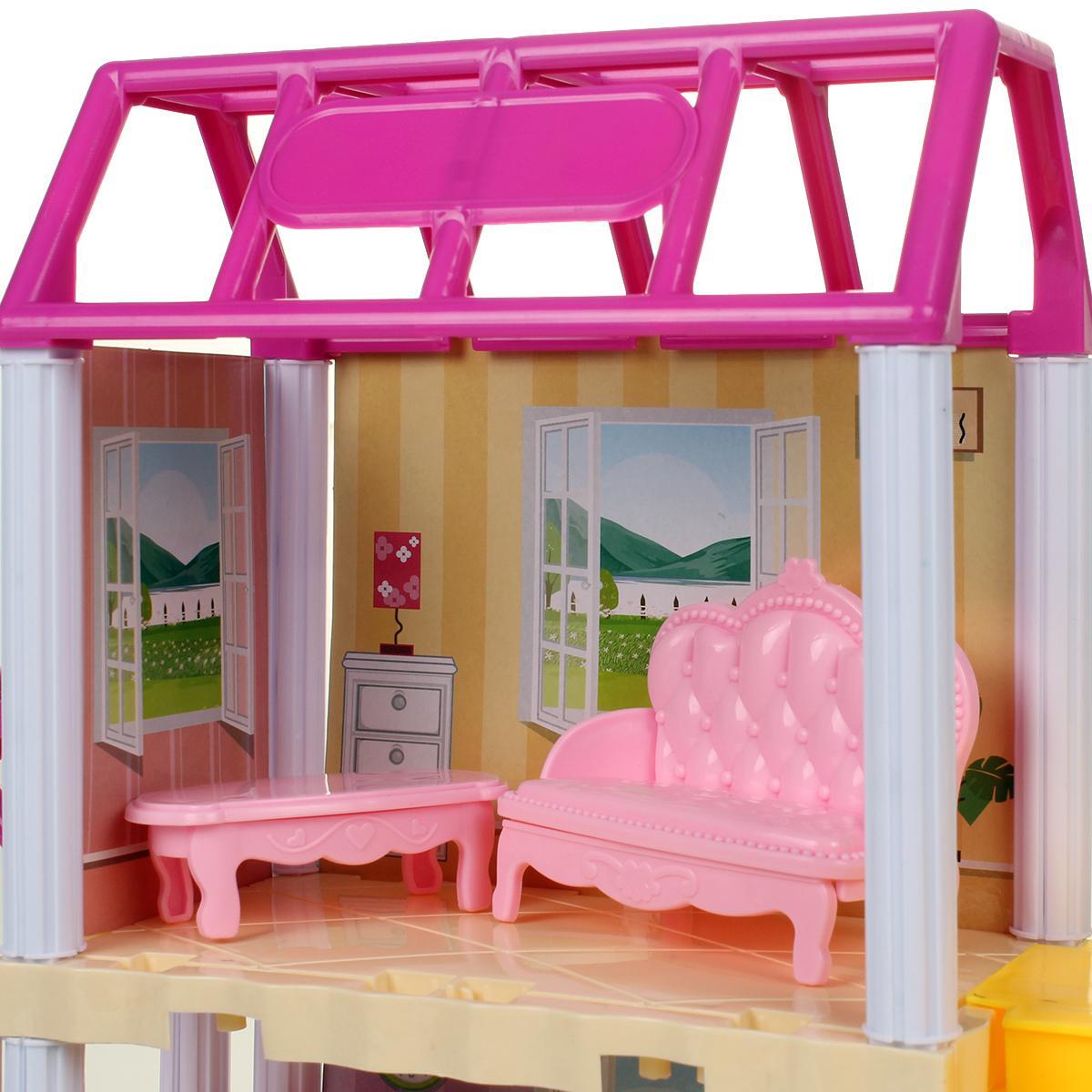 Дом для кукол со светящимися люстрами и мебелью, 2 этажа, розово-белый дизайн, 25х35х44 см, пластик, картон