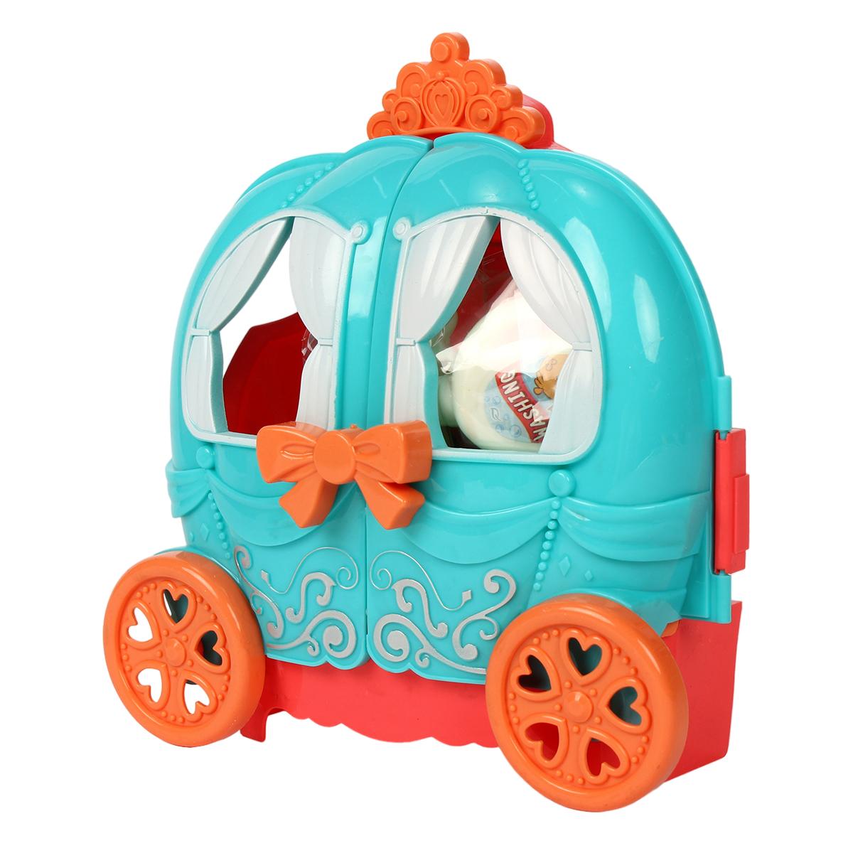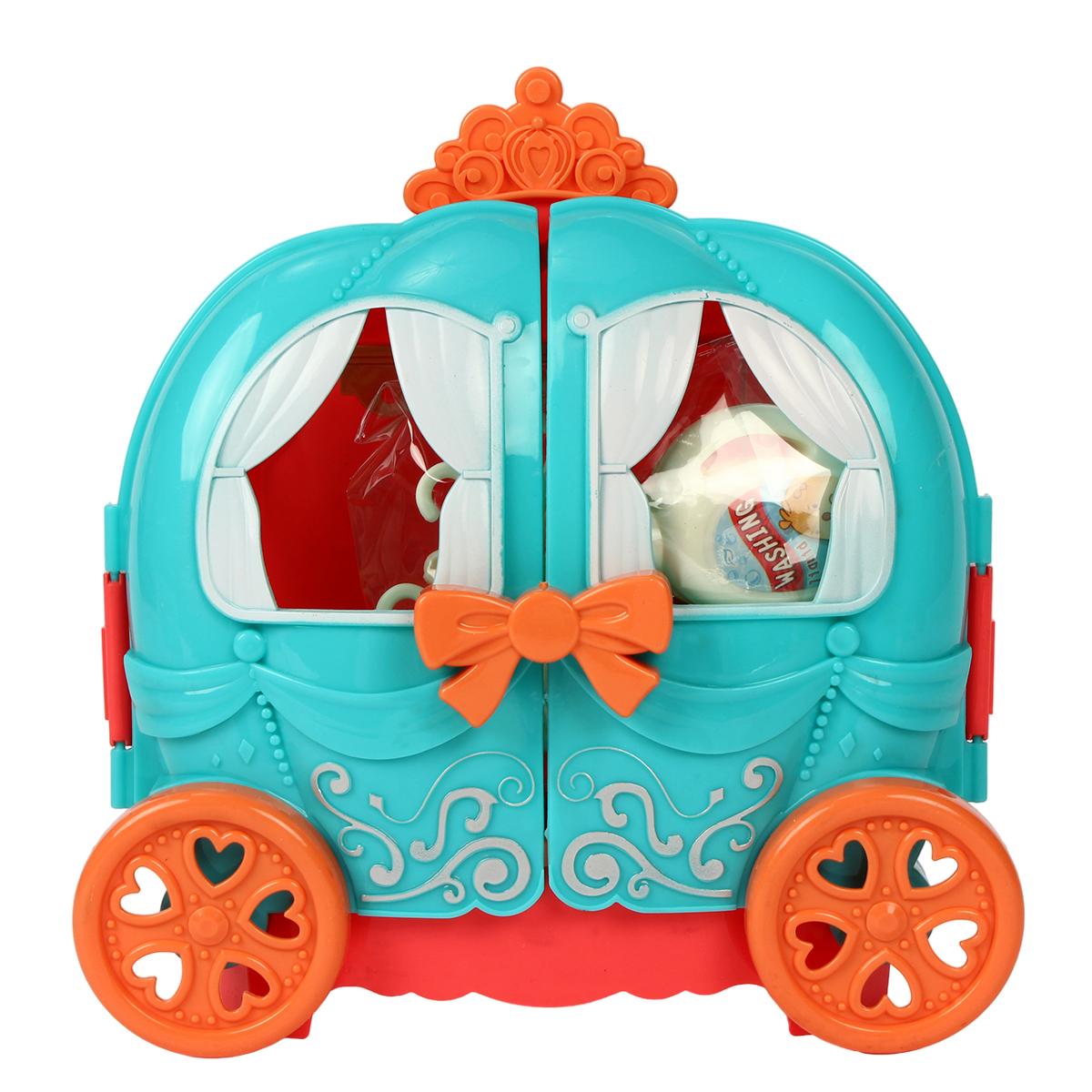 Благодаря колесам карета легко передвигается, а открывающиеся дверцы добавляют реализма в процесс игры. Дизайн включает элементы, имитирующие окна с занавесками, что делает игрушку максимально похожей на настоящую карету из сказки.