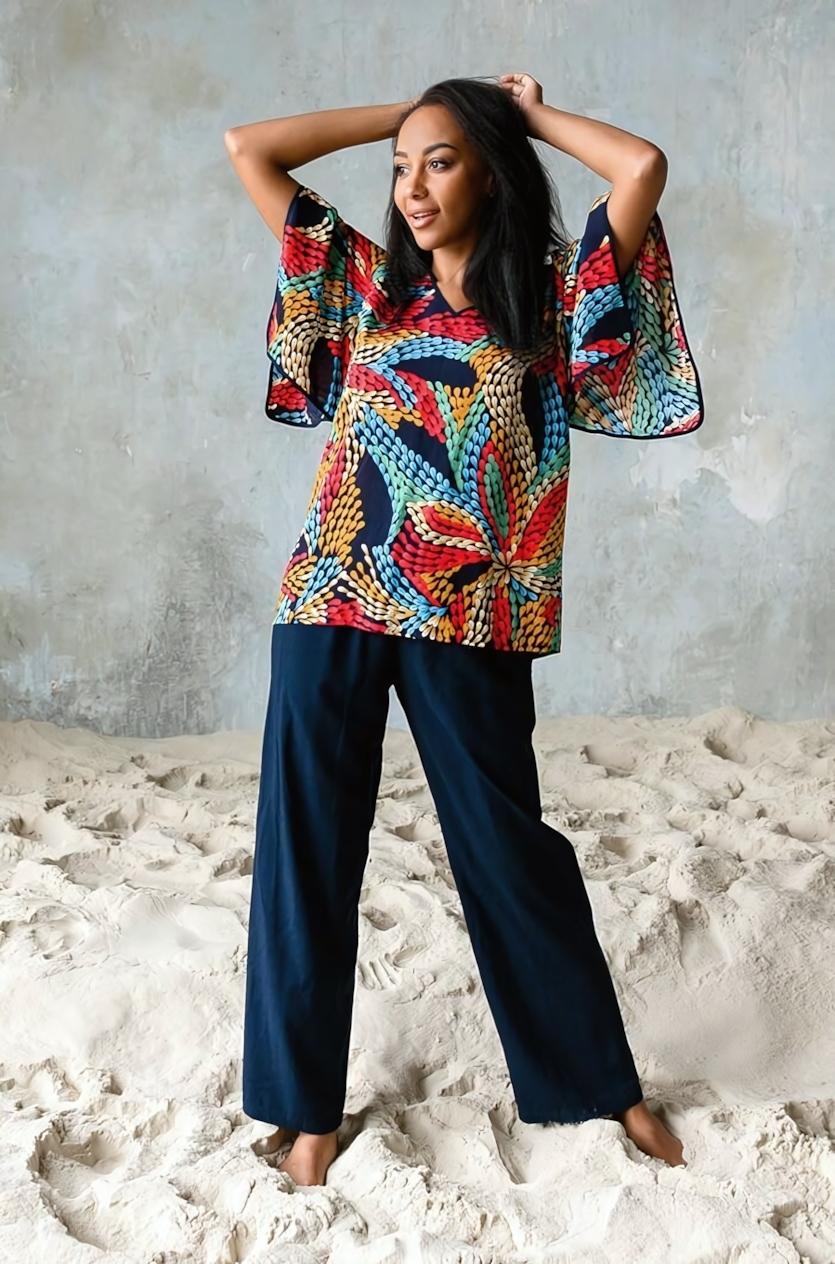 Преимущества: Высококачественная вискоза гарантирует долговечность и сохранение формы после стирки. Мягкая ткань обеспечивает комфорт в течение всего дня, а яркий многоцветный принт добавляет свежести и уюта образу. Универсальный размер 4X подходит большинству женщин.