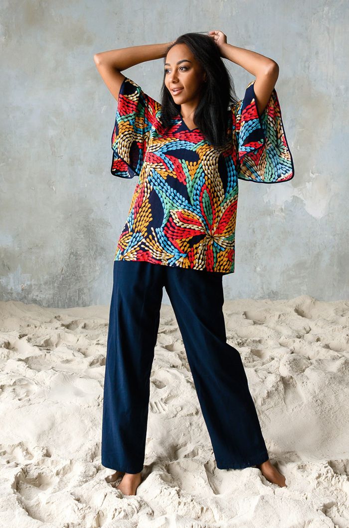 - Стильный дизайн: Туника с ярким абстрактным принтом и широкими рукавами-крылышками сочетается с однотонными прямыми брюками, создавая гармоничный образ.