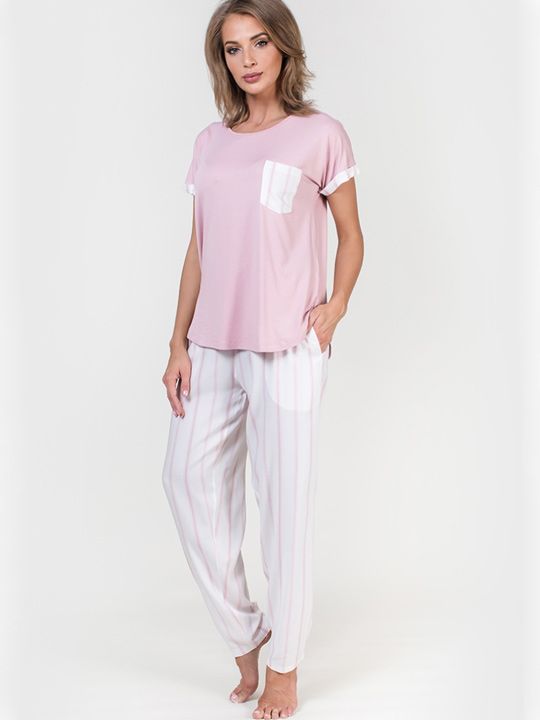 - Практичность: Комплект состоит из двух универсальных предметов — трикотажной футболки с коротким рукавом и брюк свободного кроя, которые можно комбинировать и с другой домашней одеждой.