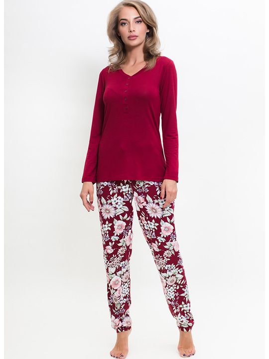 Комплект представлен в бордовом цвете с цветочным принтом на брюках. Размер M обеспечивает комфортную посадку для соответствующей размерной группы. Изделие произведено в Турции под брендом Vienetta, что гарантирует внимание к деталям и качество пошива.