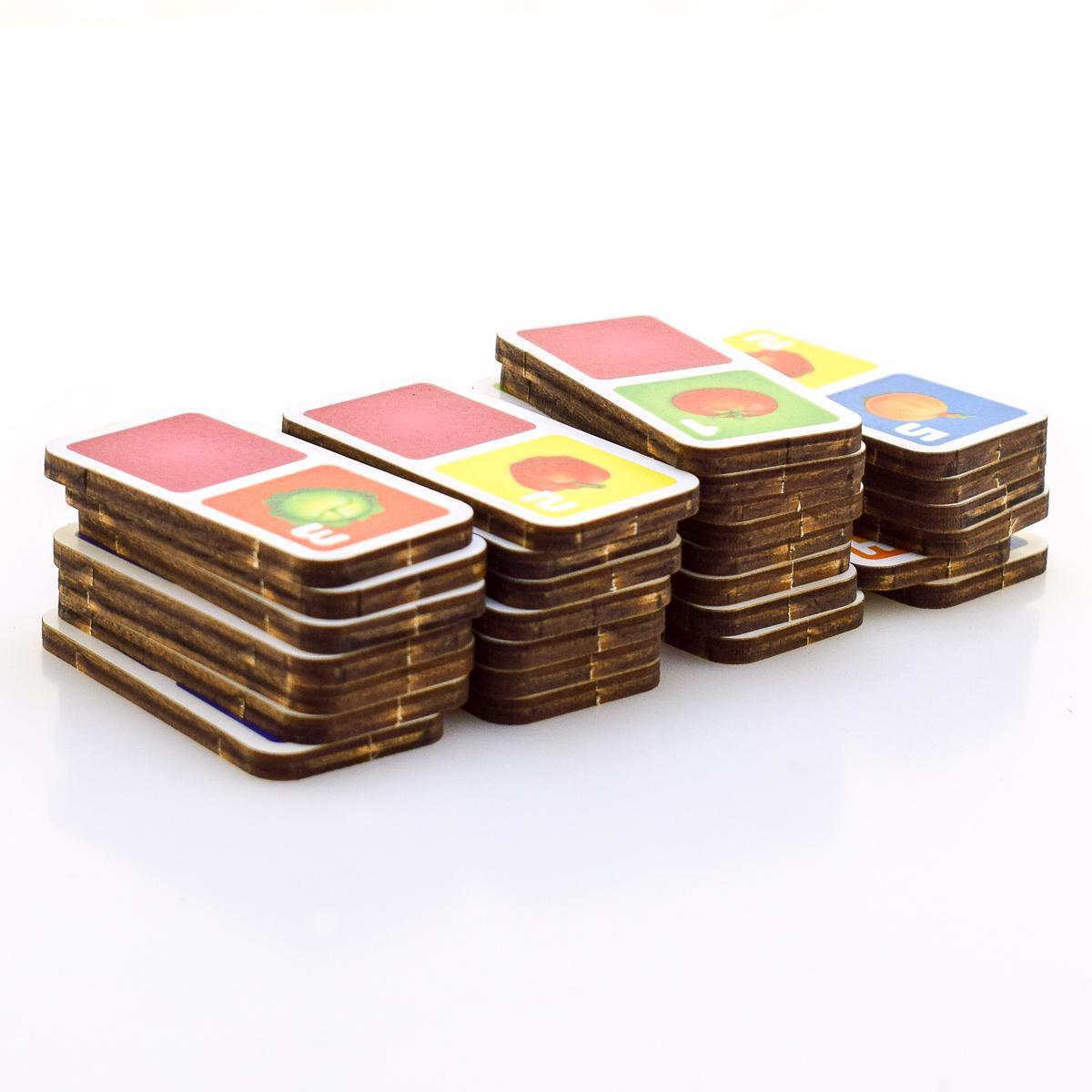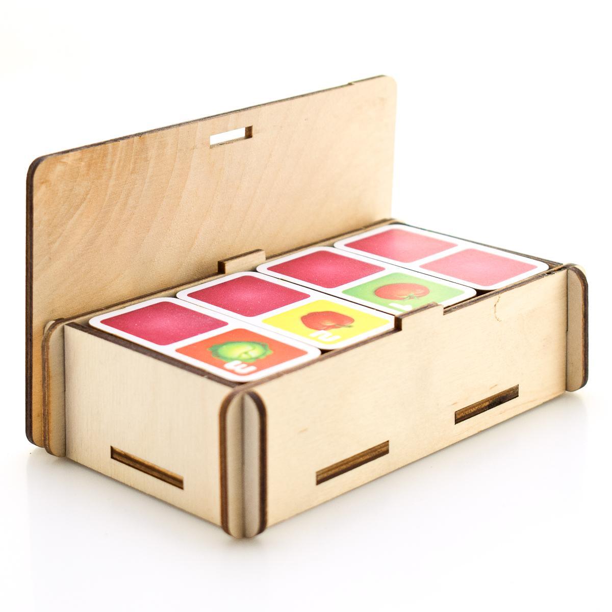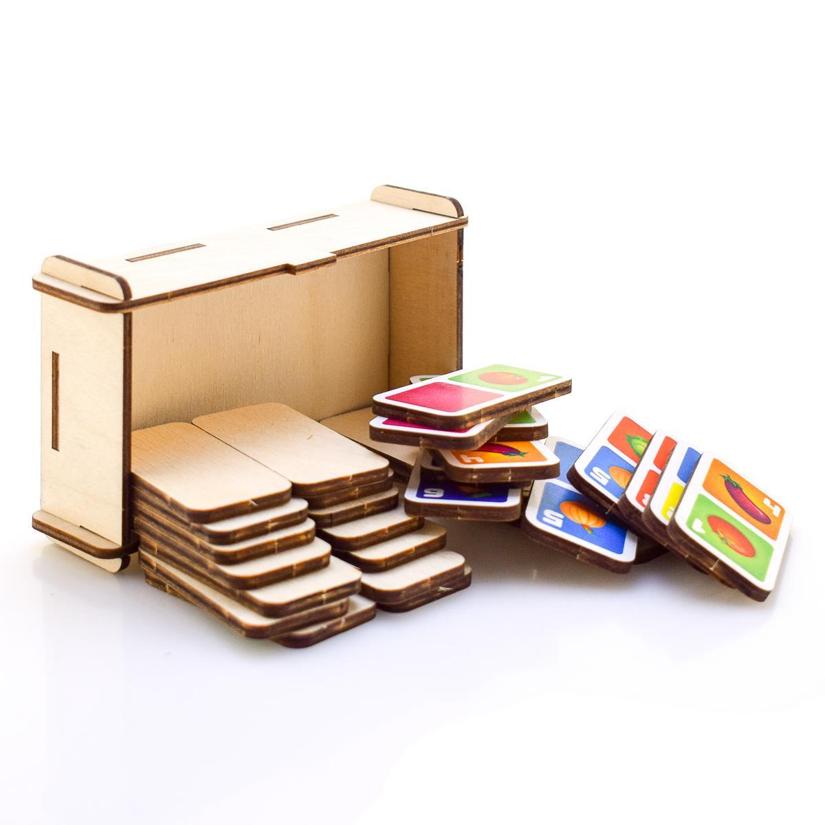 Коробка выполнена из натурального дерева, размер 20х15х5см. В набор входит 28 карточек из плотного картона с ламинацией, размер каждой карточки 5х5см. Яркие изображения овощей (помидор, перец, капуста) нанесены качественной печатью.