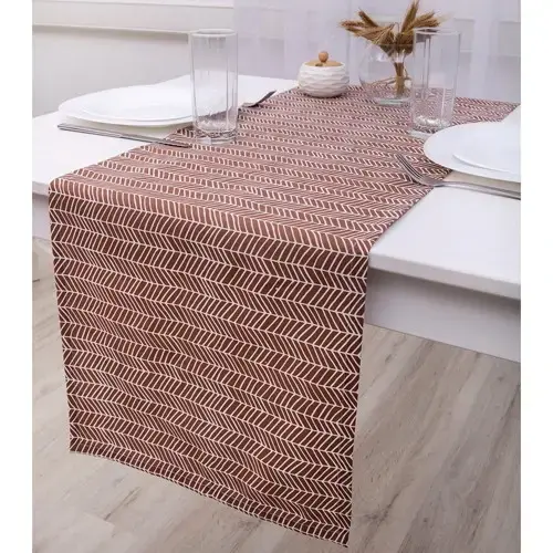 Размер дорожки составляет 40х145 см, что позволяет ей идеально подходить для большинства столов. Выполненная в коричневых и бежевых оттенках, она добавляет тепла и уюта в ваш дом. Материал дорожки — текстиль, что обеспечивает долговечность и практичность в использовании.