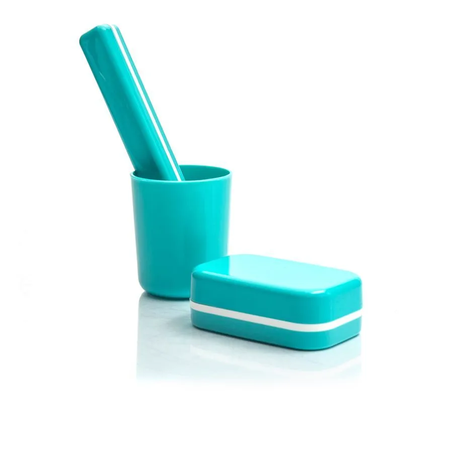 Отправляясь в поездку, командировку или на отдых, важно сохранить привычный комфорт и гигиену. Этот дорожный набор из трёх предметов — стакана, мыльницы и футляра для зубных щеток — создан специально для этого. Все аксессуары выполнены в едином стиле и ярком бирюзовом цвете, что делает их не только функциональными, но и эстетически приятными. Комплект поможет организовать личное пространство в любой ванной комнате отеля, гостевого дома или съёмной квартиры.