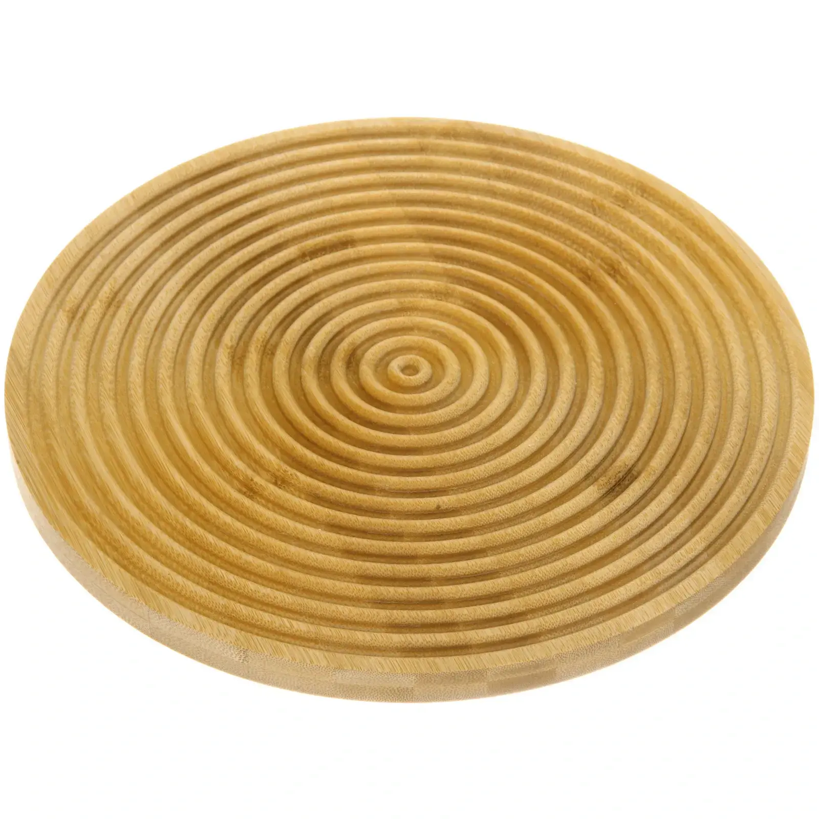 Размер доски составляет 28 см в диаметре, что делает её удобной для сервировки различных блюд. Светло-коричневый цвет бамбука придаёт ей элегантный вид, а рифленая текстура добавляет уникальности. Эта доска станет не только функциональным, но и стильным элементом вашего стола.