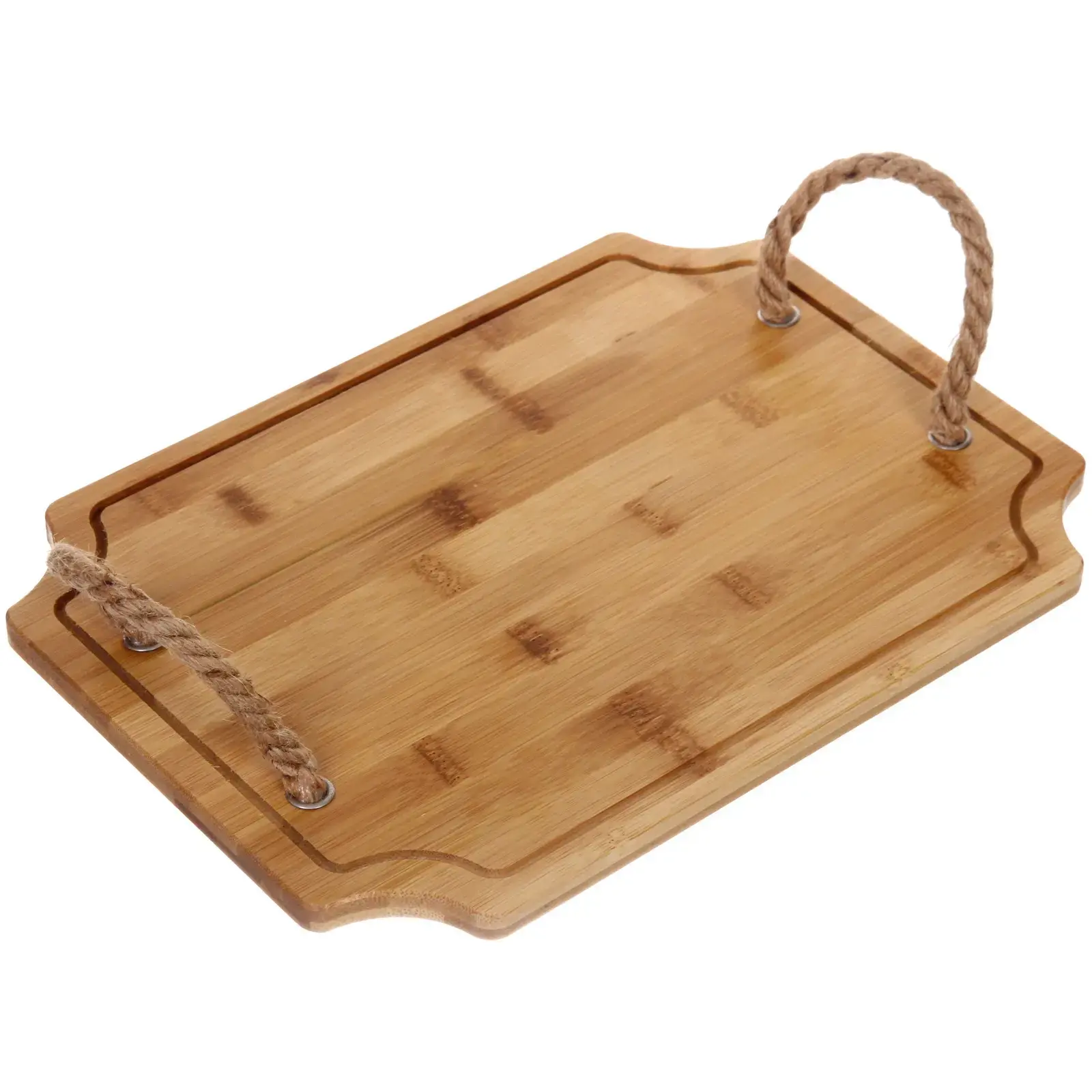 Доска имеет прямоугольную форму с закругленными углами, что добавляет ей элегантности. Её светло-коричневый цвет подчеркивает натуральную текстуру дерева, а ручки из веревки придают дополнительный шарм. Размеры 33х23 см делают её универсальной для различных блюд. Не упустите возможность сделать вашу кухню более функциональной и стильной с помощью этой бамбуковой доски для подачи!