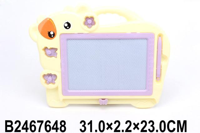 Размер рабочей поверхности: 25х18 см. В комплекте: 1 доска, 1 магнитный стилус, 4 сиреневых трафарета (бабочка, цветок, птица, пчела). Материал корпуса — ударопрочный пластик с гладкой обработкой. Рекомендованный возраст: от 3 лет.