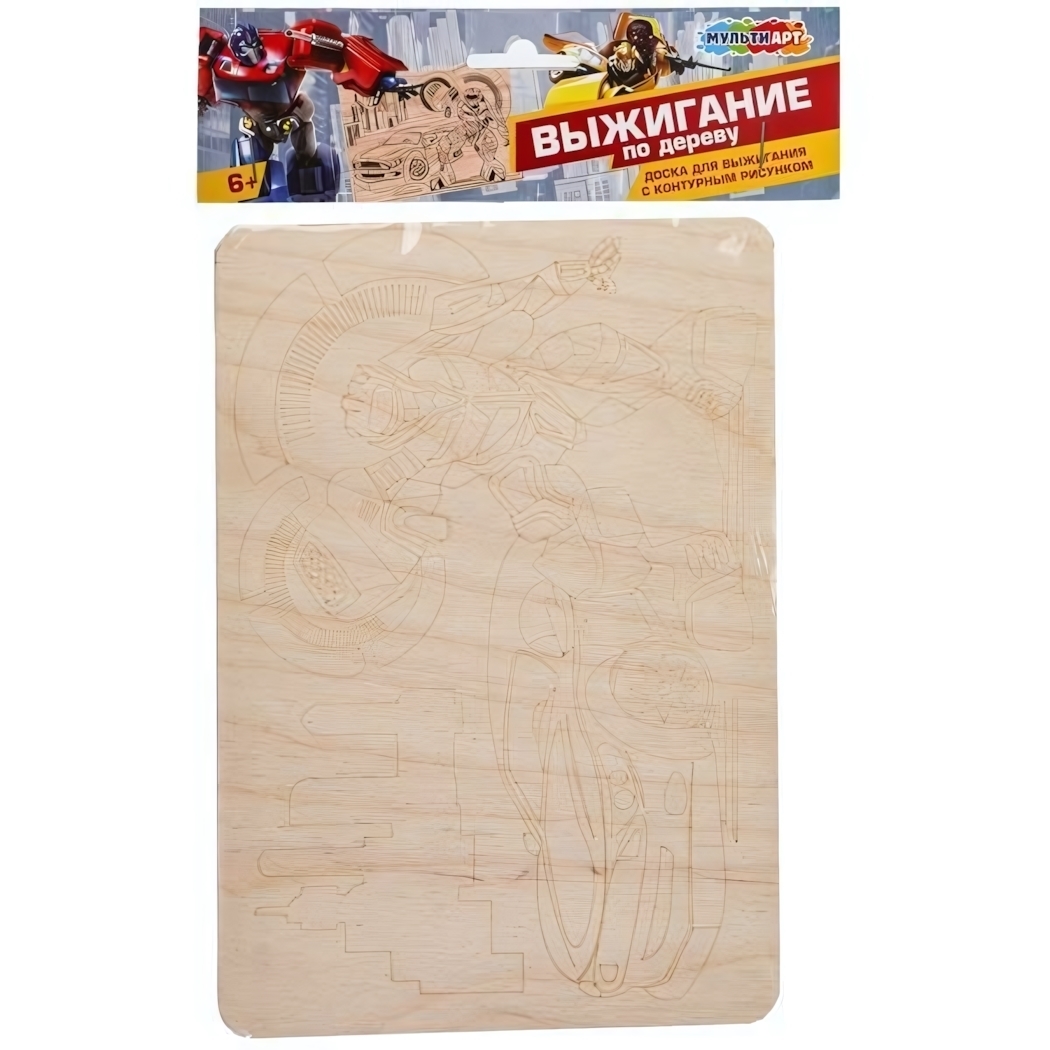 Размер доски составляет 20х22 см, что делает ее удобной для работы. Изготовленная из дерева, она обеспечивает долговечность и надежность в использовании. Доска для выжигания 'Трансформеры' станет отличным подарком для любого маленького художника!