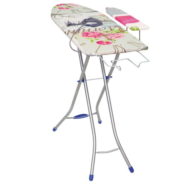 Основа из ДСП обеспечивает стабильность и ровную поверхность для качественного разглаживания ткани. Металлические ножки с Х-образной конструкцией придают устойчивость во время работы. Тканевый чехол с декоративным принтом не только украшает изделие, но и способствует равномерному распределению пара.