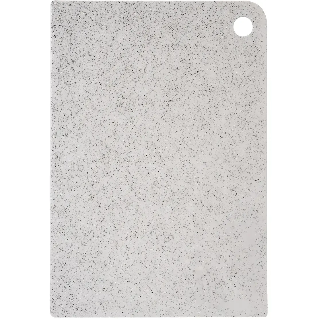 Доска изготовлена из прочного пластика, что делает её легкой и простой в уходе. Она имеет гладкую поверхность, что предотвращает прилипание продуктов и облегчает процесс мытья. В правом верхнем углу предусмотрено отверстие для удобного хранения или подвешивания, что добавляет дополнительный комфорт в использовании.