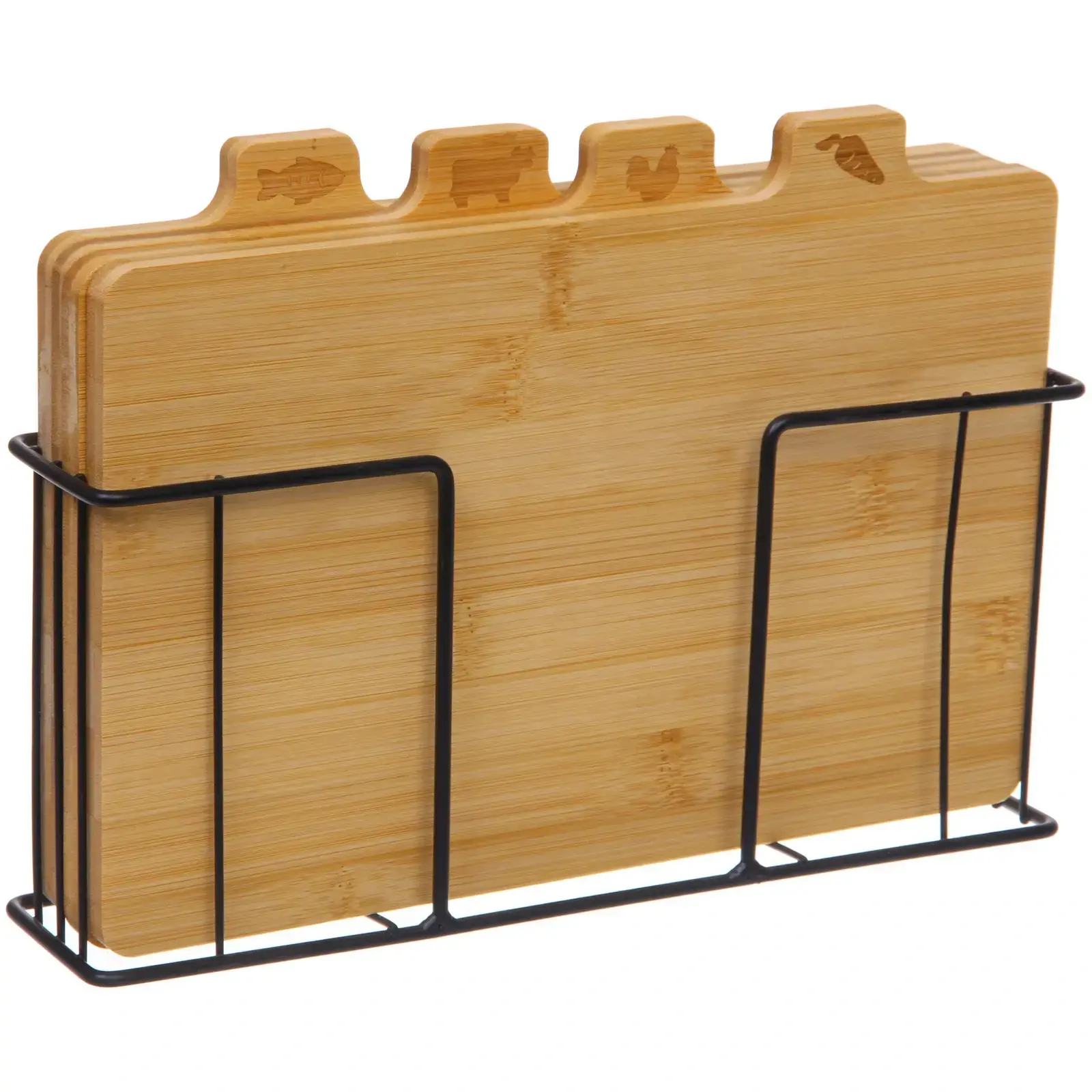 4 бамбуковые доски в стильной металлической подставке сочетают практичность и эстетику. Фигурные вырезы с изображениями животных создают настроение на кухне, а продуманная конструкция экономит пространство.