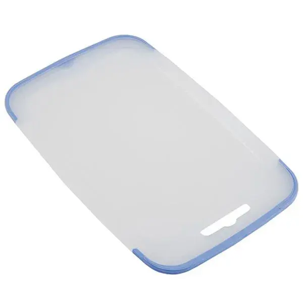 Доска из прочного полупрозрачного пластика с яркой голубой окантовкой гармонично впишется в интерьер любой кухни и подойдет для нарезки овощей, фруктов, сыра, хлеба, колбасы. Овальная ручка-выемка обеспечивает удобство перемещения и фиксации, ускоряя работу и делая процесс максимально комфортным.